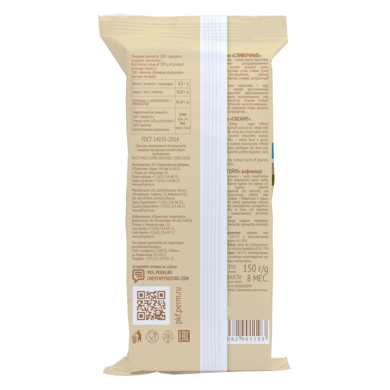 Вафли Сливочные ("Как из Детства"), ТМ "Честный состав", натуральные, без пальмового масла, не содержат ГМО, 150 гр., упаковка, Пермская Фабрика интересное: