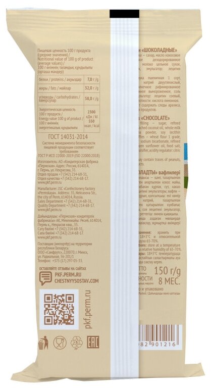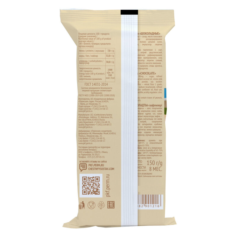 Вафли Шоколадные, ТМ "Честный состав", натуральные, без пальмового масла, 150 гр., упаковка, Пермская Фабрика интересное: