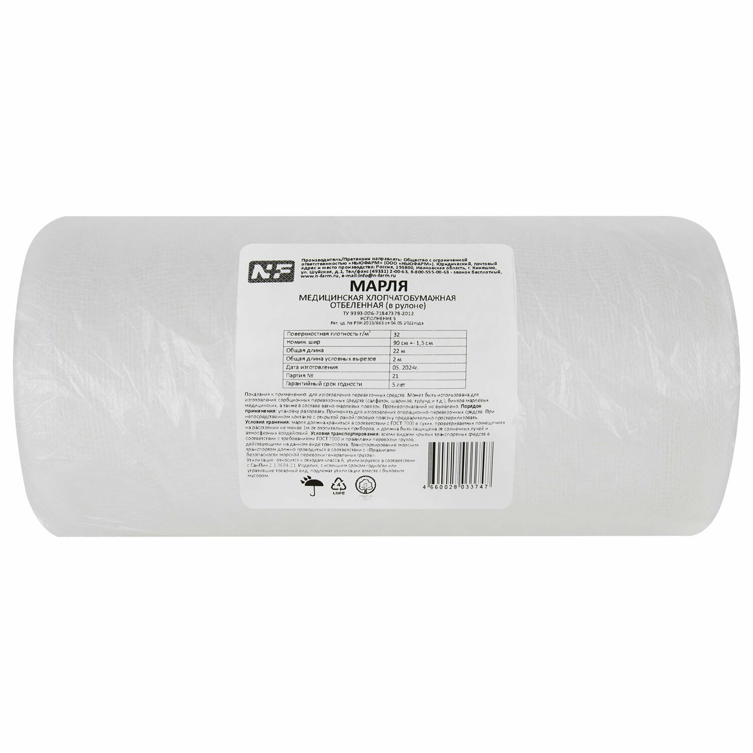 Марля медицинская отбеленная в рулоне, отрез 5 м, плотность 28(±2) г/м2, NF