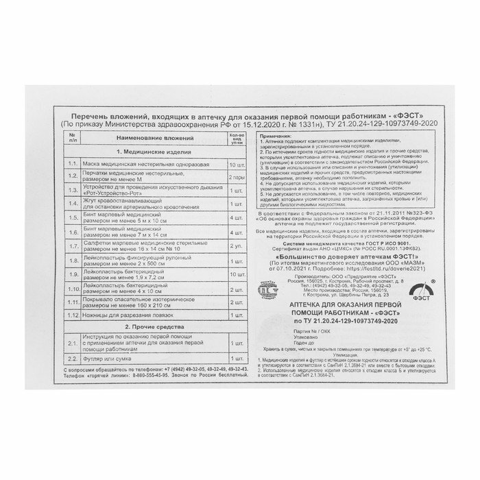 Аптечка ФЭСТ Работникам (футляр №2) по ТУ 21.20.24-129-10973749-2020 (футляр 8-2)