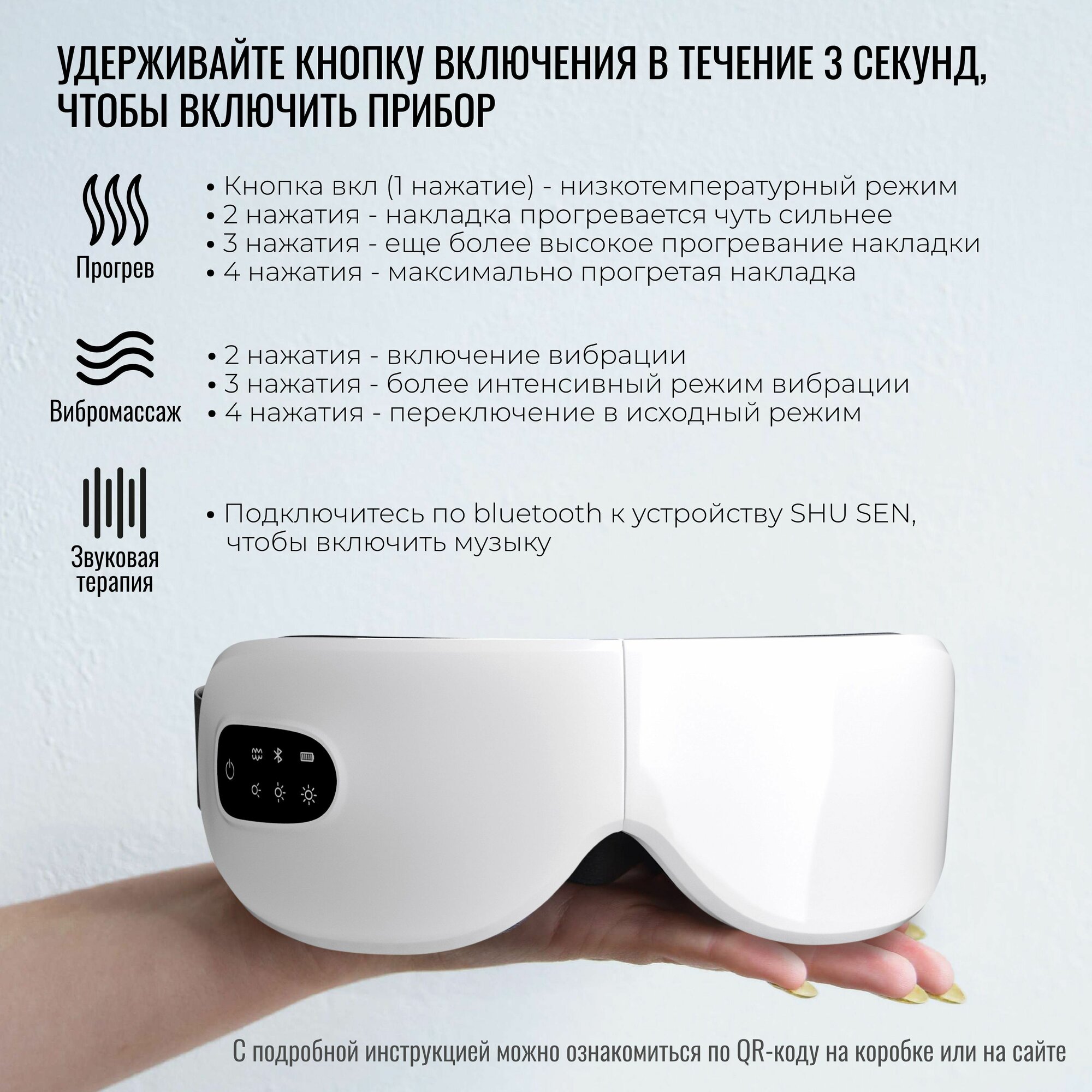 | Дополнительная информация | Удерживайте кнопку включения в течение 3 секунд, чтобы включить прибор. 1. Прогрев: При первом включении будет работать низкотемпературный режим накладки для глаз, загорится синий индикатор |