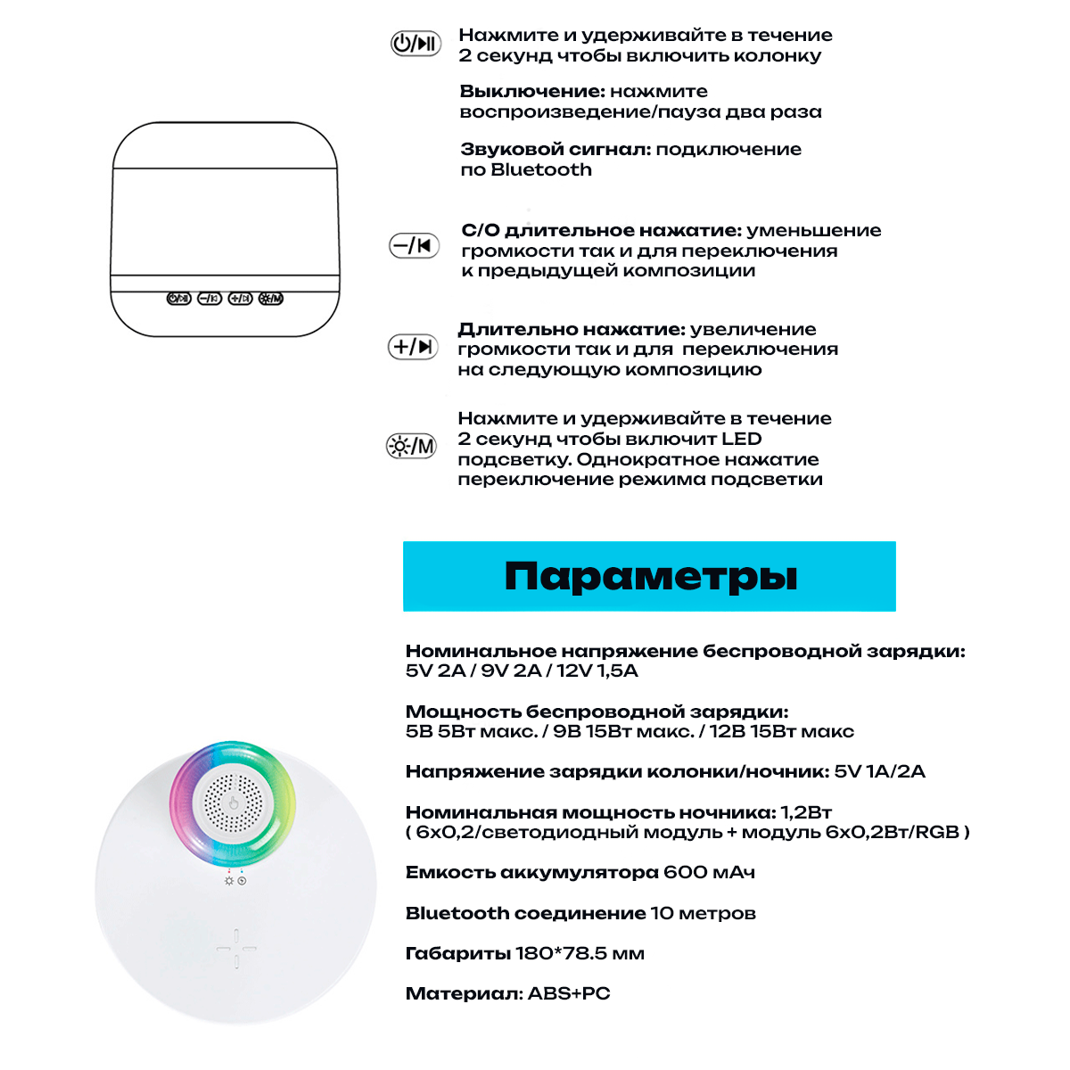 | Функции | беспроводная зарядка, встроенный аккумулятор |
