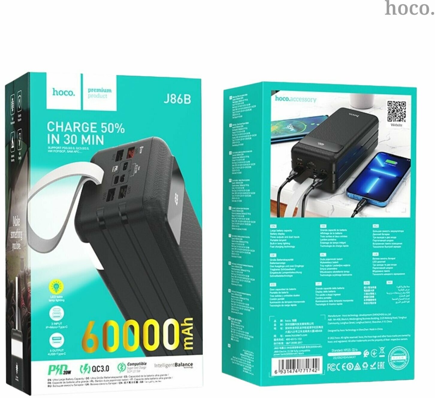 Power Bank (повербанк с быстрой зарядкой) Hoco J86B 60000mAh + LED Фонарик