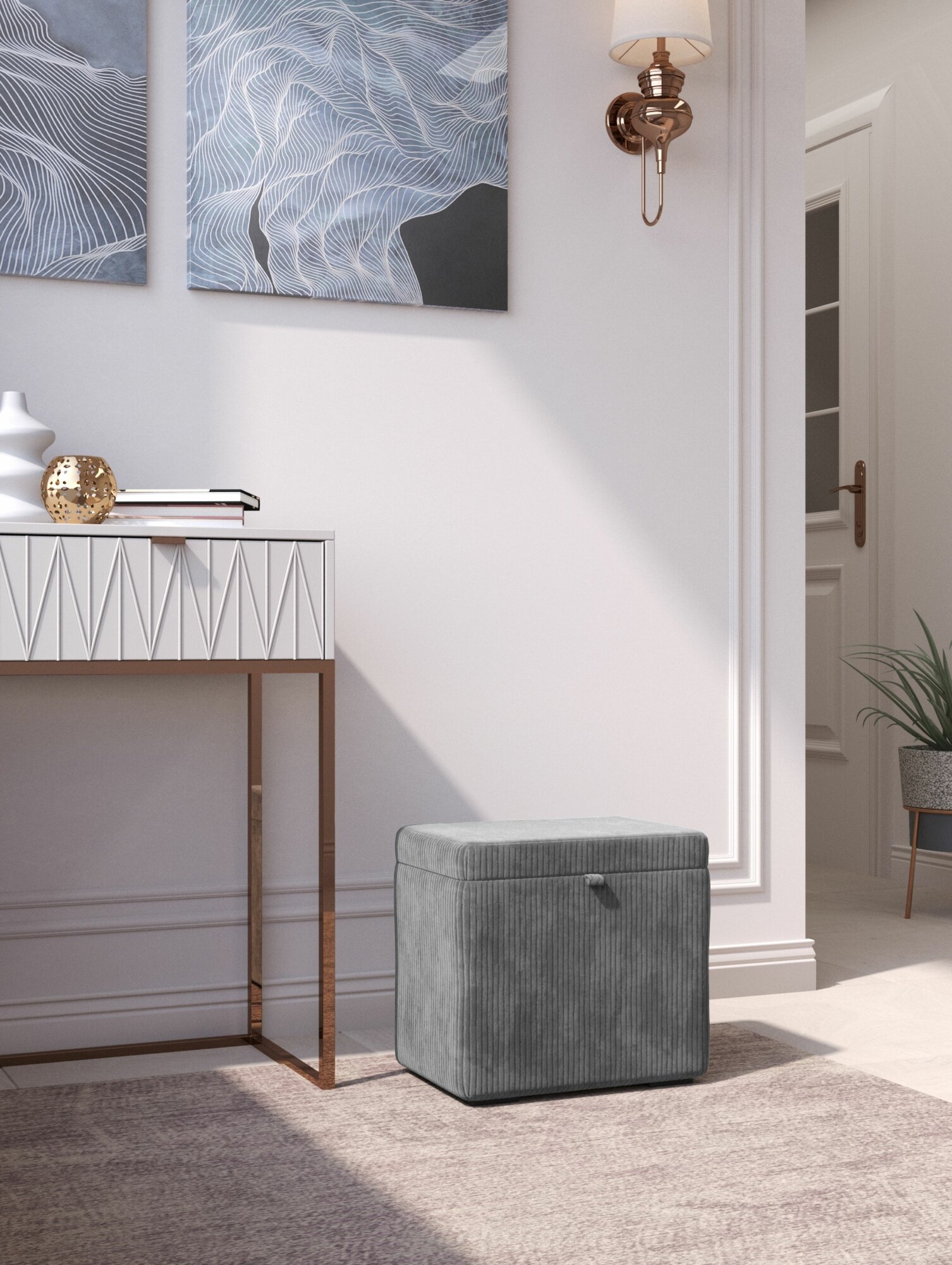 Пуфик в прихожую с ящиком для хранения, рубчик, светло-серый, Studioаkd