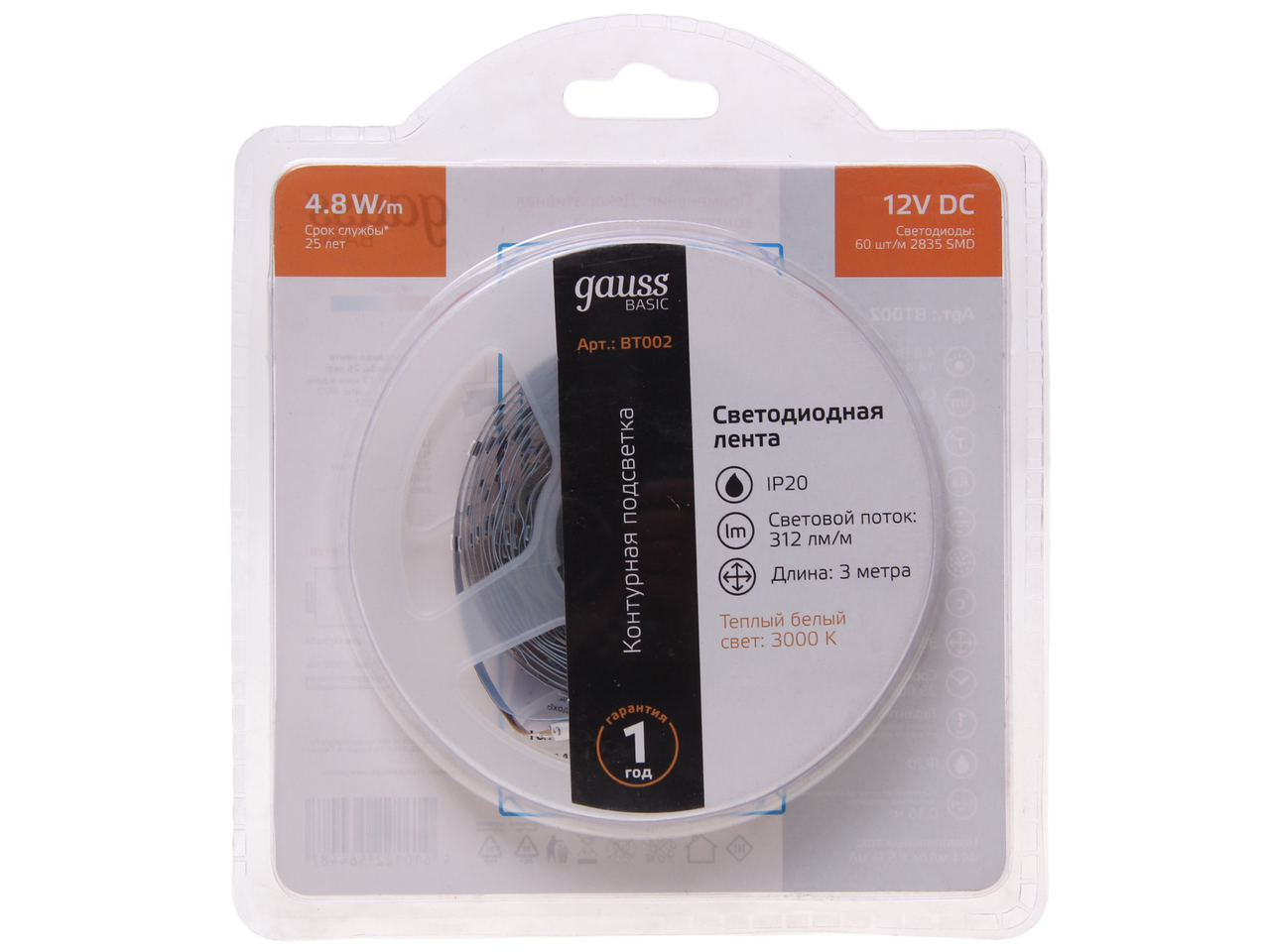 СохранитьЛента светодиодная 2835/60 12V 4,8W/m 312lm/m 3000K 8mm IP20 3m Gauss Basic интересное: