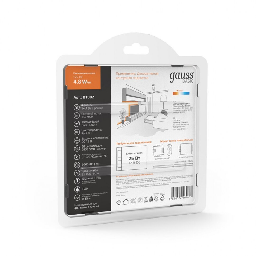 Светодиодная лента Gauss Basic LED 2835/60 12V 4,8W/m 312lm/m 3000K 8mm IP20 3m 1/100