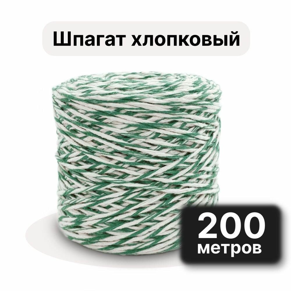 Шпагат хлопковый 2 мм 200 м, для колбасы, для копчения рыбы, для запекания мяса, для подвязки растений, веревка для теплицы, бело-зелёный