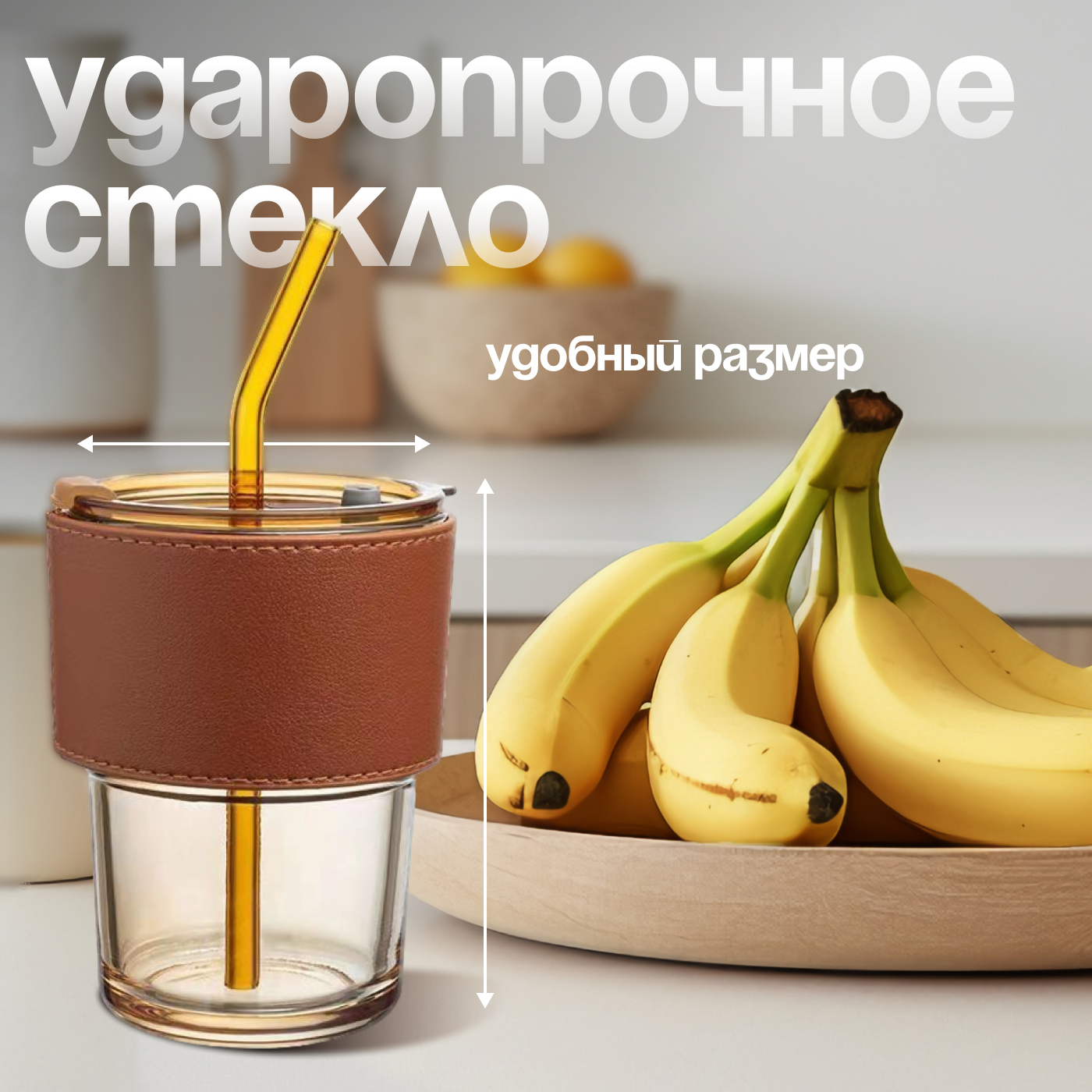 Стакан стеклянный для напитков с трубочкой, кожаным ремешком и кейсом, 450 мл, Amber, PERFECTO LINEA (31-450201)