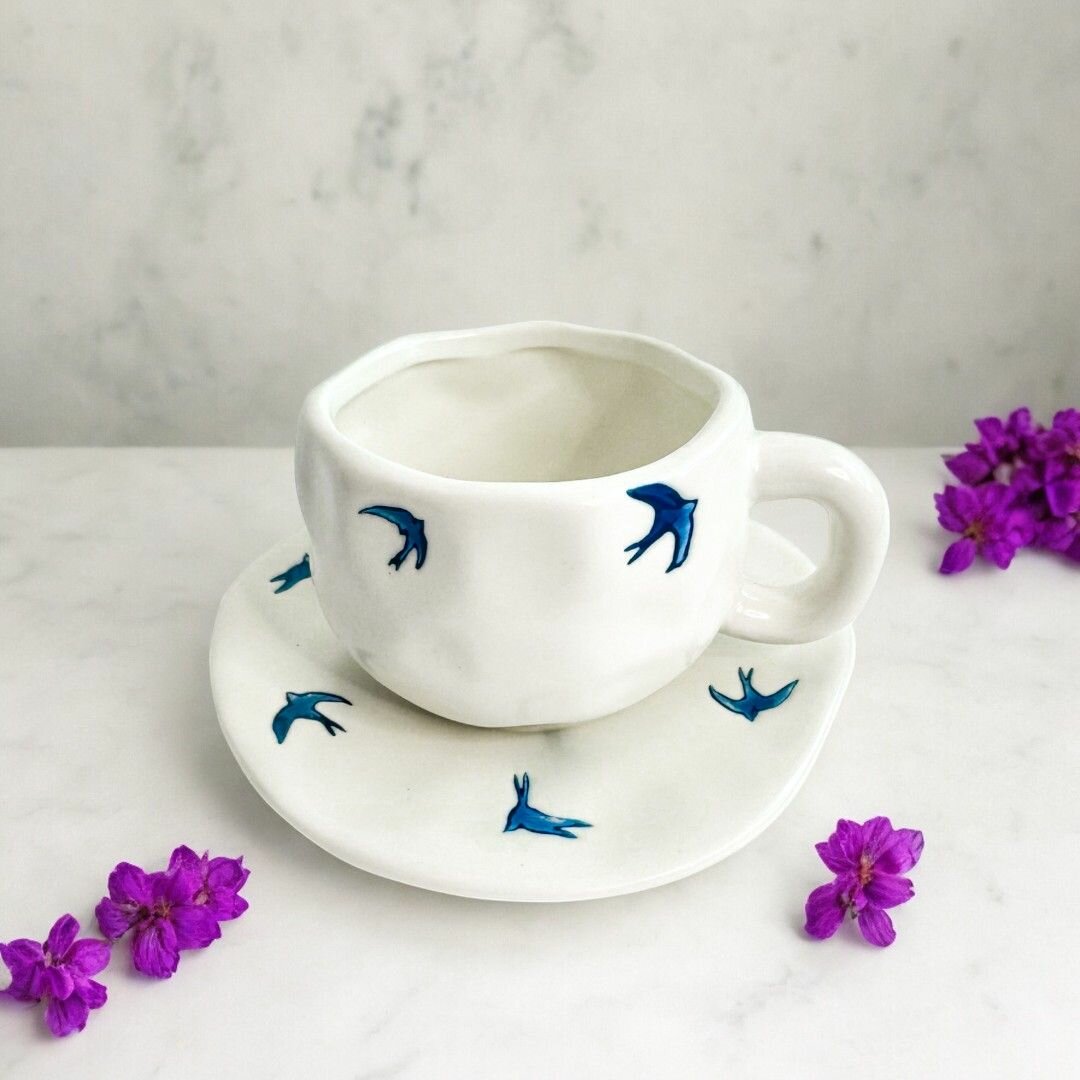 Купить Чайная пара керамическая кружка с блюдцем Ласточки