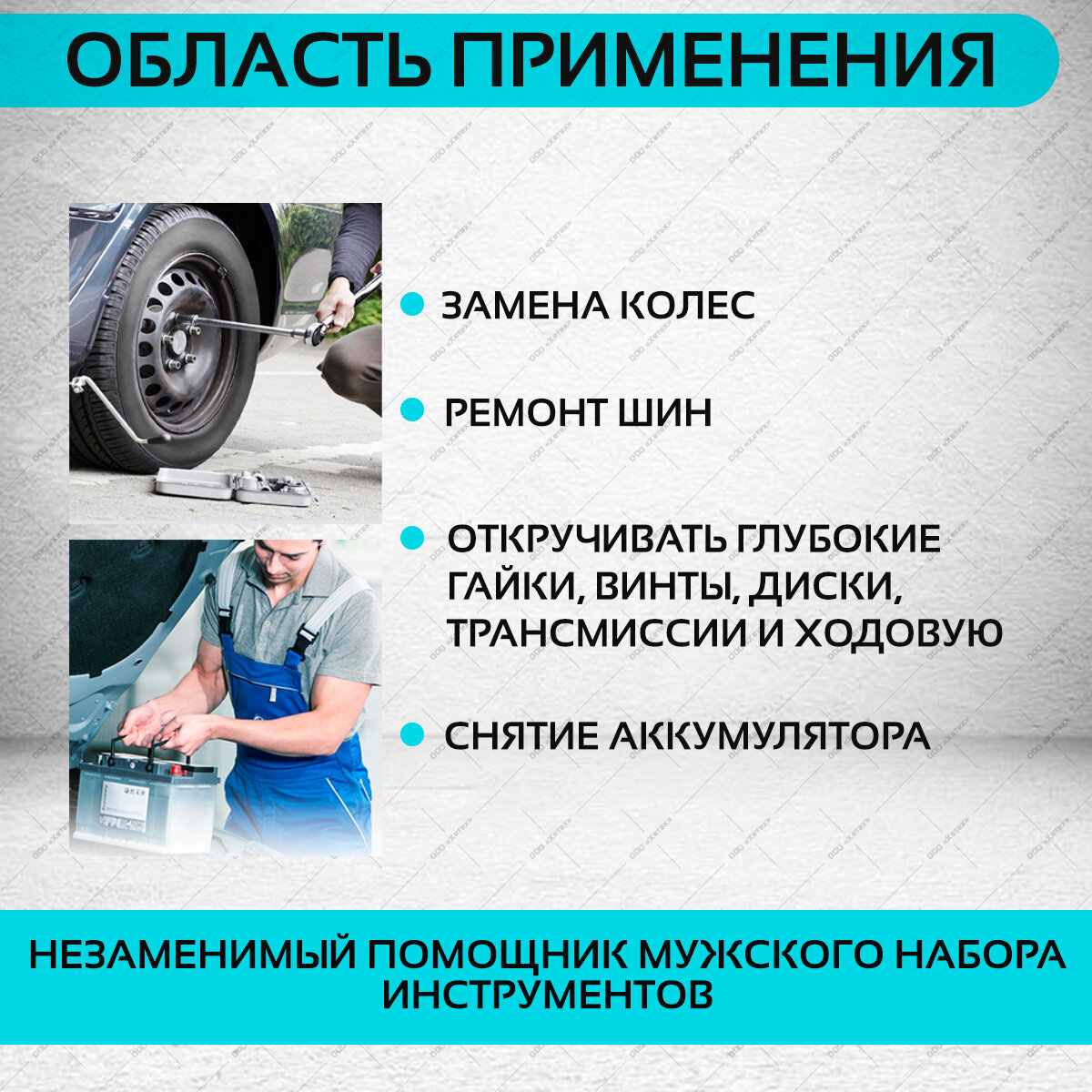 | Подробная комплектация | Набор упакован в прочный ударопрочный кейс: 1 шт - Крестообразный баллонный ключ 1/2" 2 шт - торцевые головки 17-19 мм, 21-23 мм 1 шт - Удлинитель вороток 1/2" |