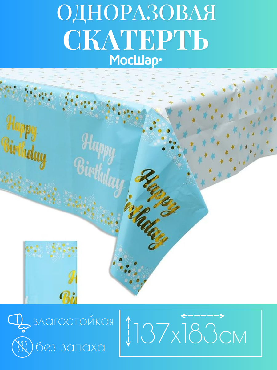 Купить Скатерть Мосшар "Happy Birthday", одноразовая, на День Рождения, 137 х 183 см голубой принт