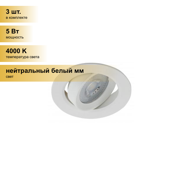 | Комплектация | Точечный светильник встраиваемый светодиодный ЭРА (LED) круглый поворотный 5Вт 4000К 325Лм, Б0037037, белый |