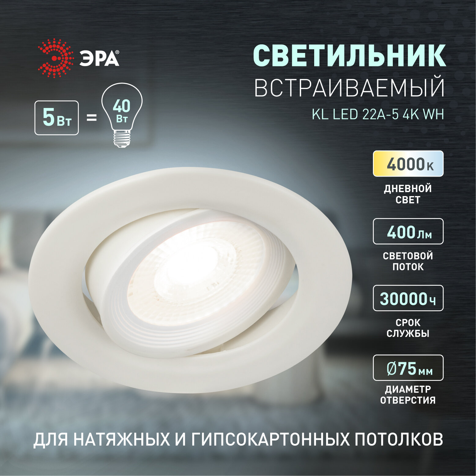 | Дополнительная информация | Светильник ЭРА KL LED 22A-5 4K WH, LED, 5 Вт, 4000, холодный белый, цвет арматуры: белый, цвет плафона: бесцветный |