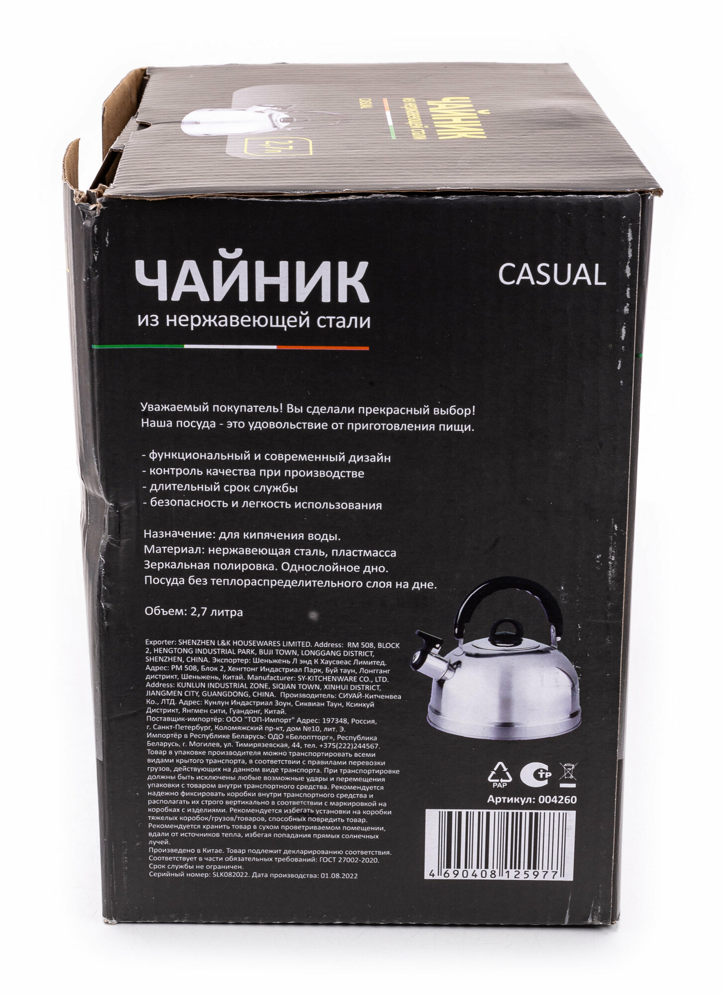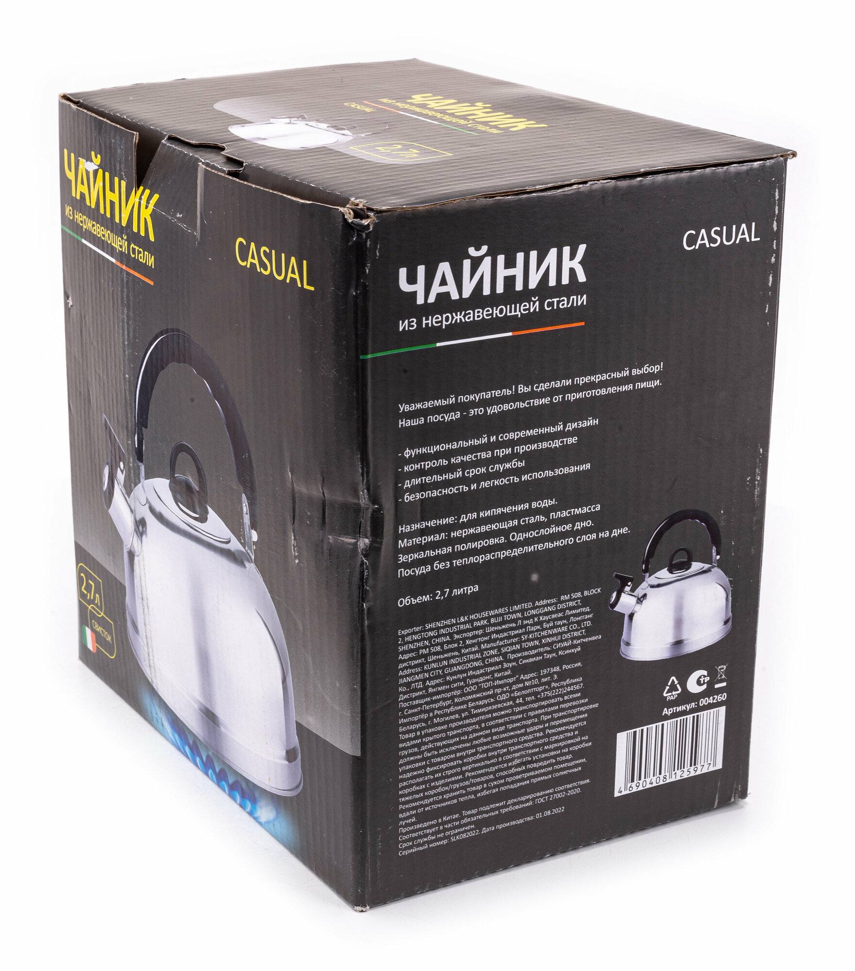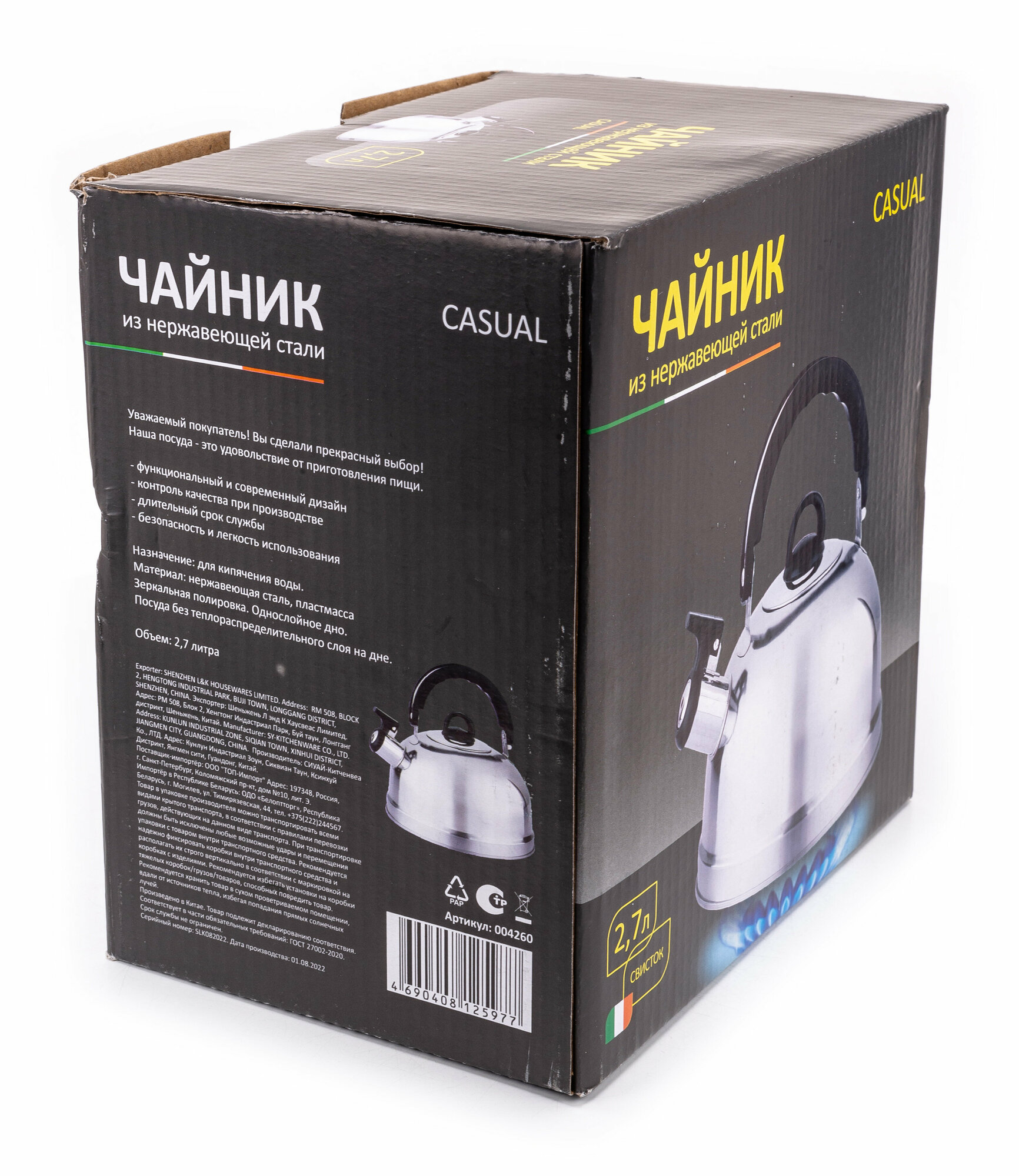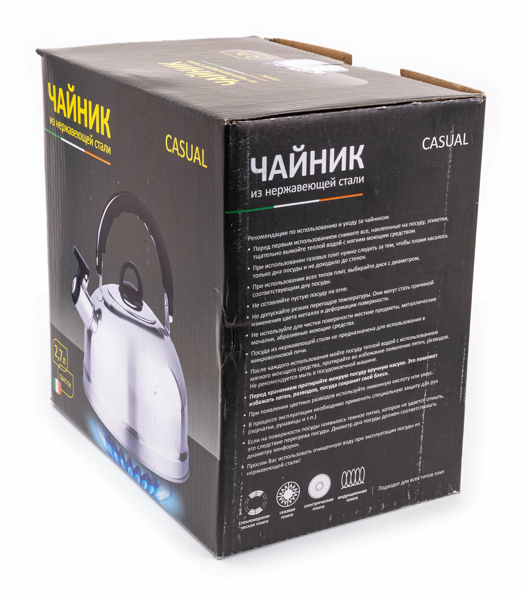Чайник Casual, объем 2,7 л, из нерж стали со свистком, зеркальная полировка, без тм (004260)