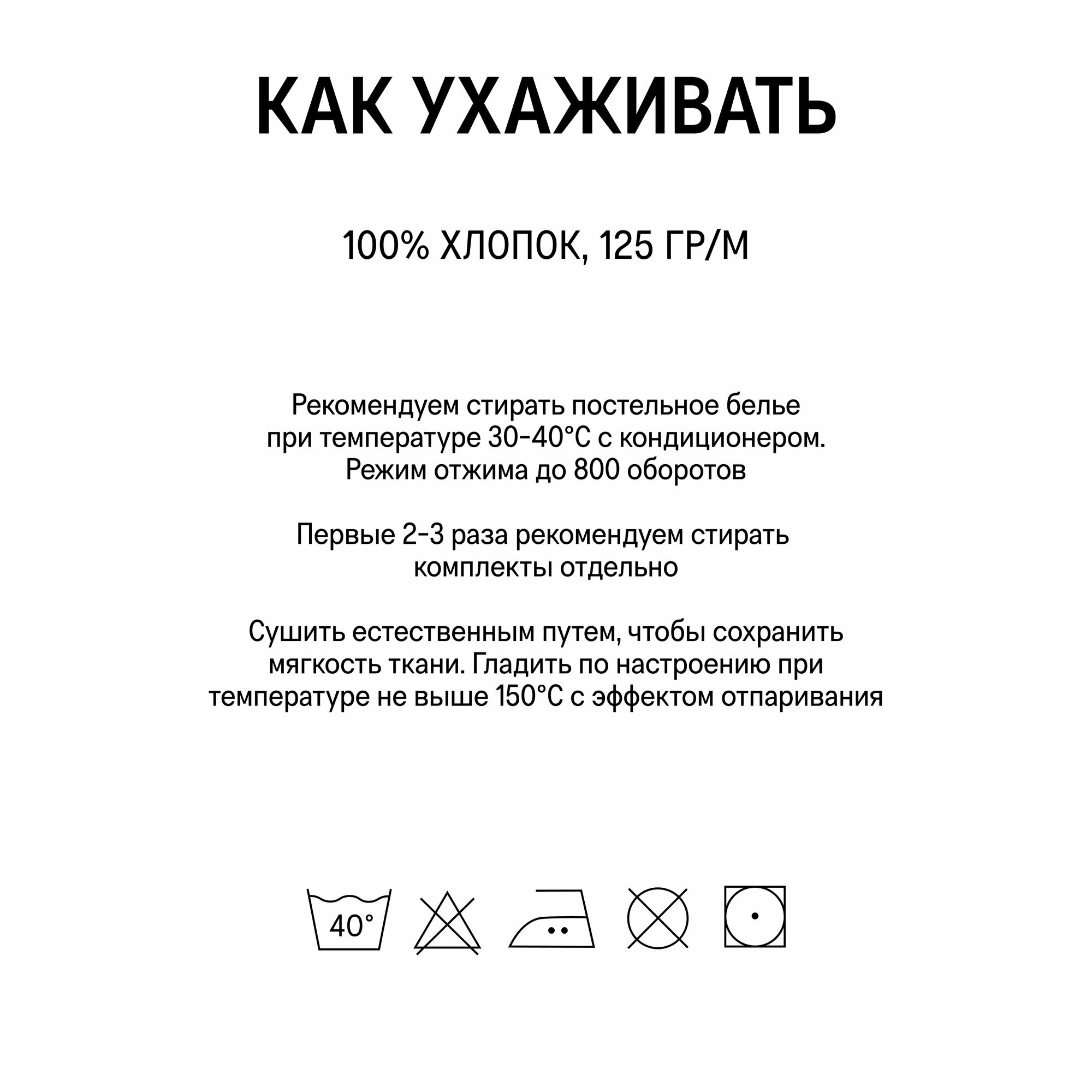 | Дополнительная информация | Как ухаживать: первые 2-3 раза рекомендуем стирать комплекты отдельно. Затем можно стирать разные цвета вместе при температуре не более 40 С. Не рекомендуем заливать жидкие стиральные средства в барабан с бельем. Машинная сушка на деликатном режиме. |