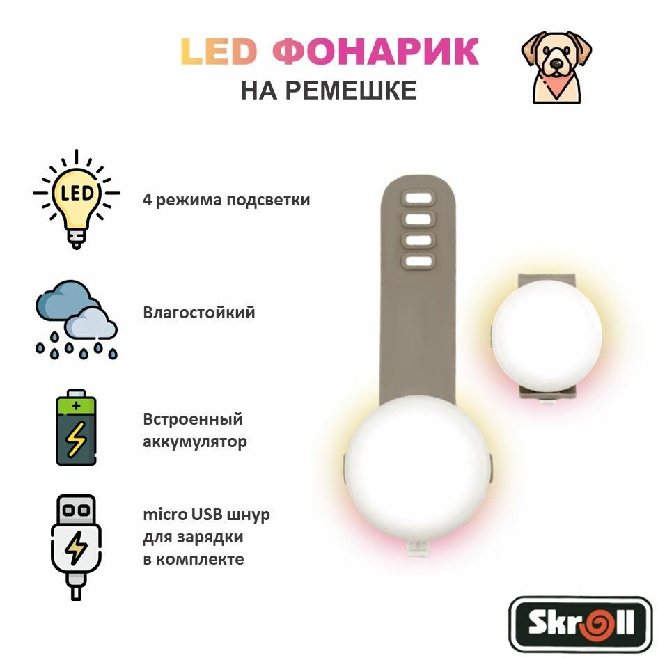 Светящийся брелок на ошейник для собак Skroll на ремешке, светодиодный LED фонарик micro USB / Блинкер / Серый интересное: