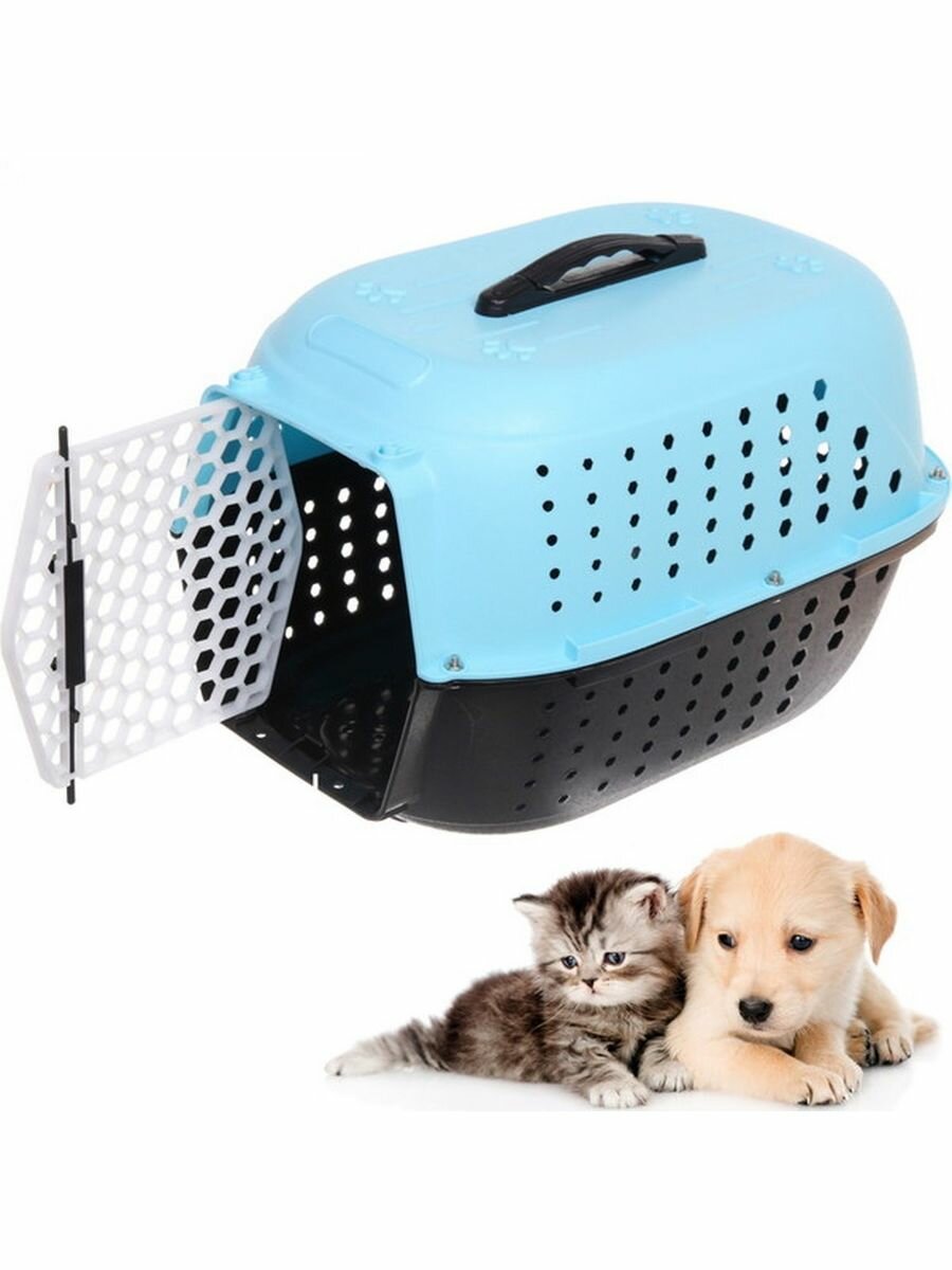 Пластиковая переноска для кошек и собак мелких пород "Чистый котик" 48*32*30 голубая