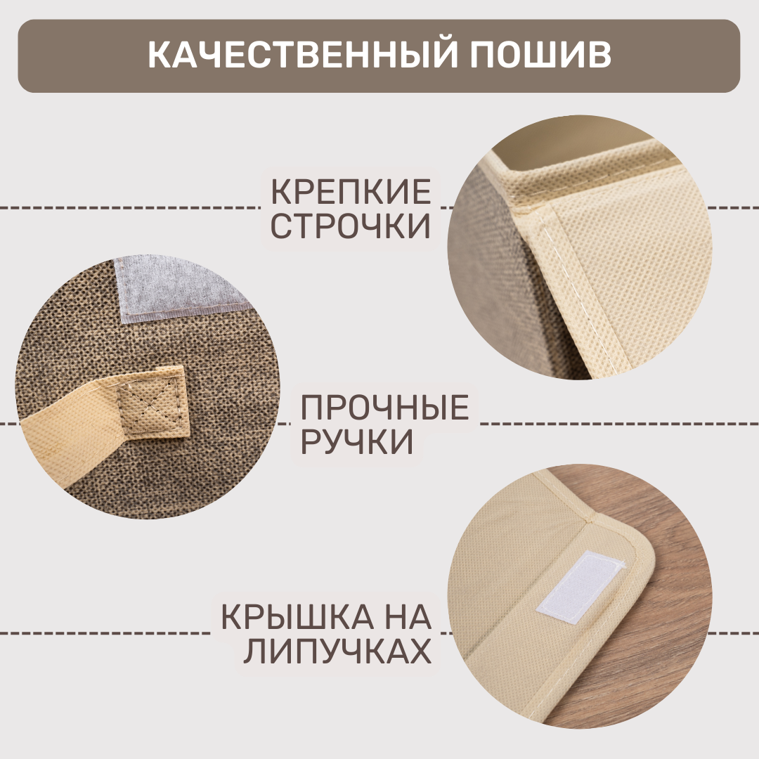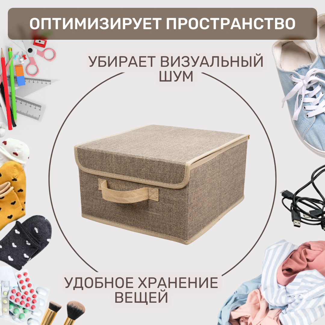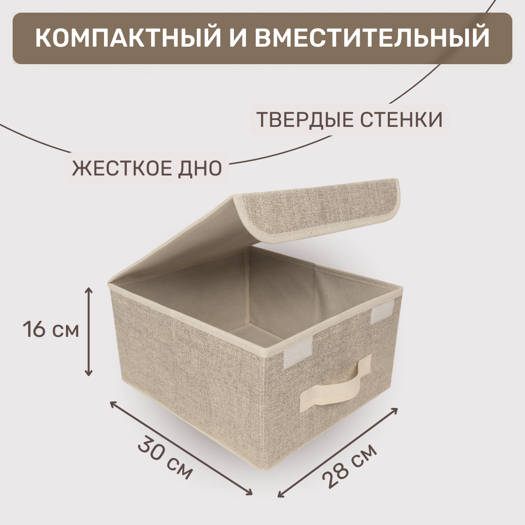 | Комплектация | Короб складной Размер: 28x30x16 см Материал: искусственный лен 80 г/см, картонные вставки, тканевые ручки |