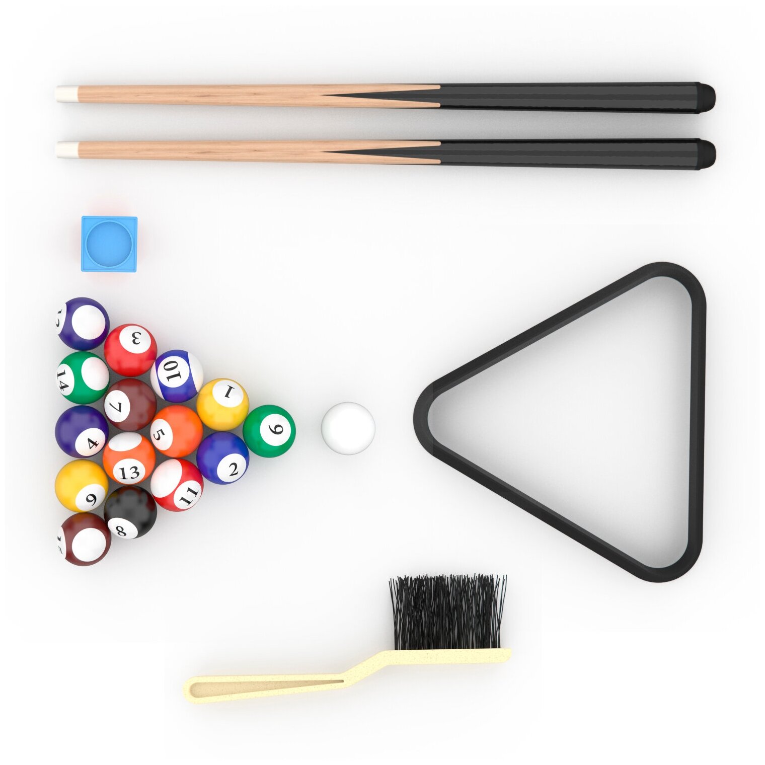 | Комплектация | 2 кия, набор из 15 шаров, треугольник, щётка, мел |