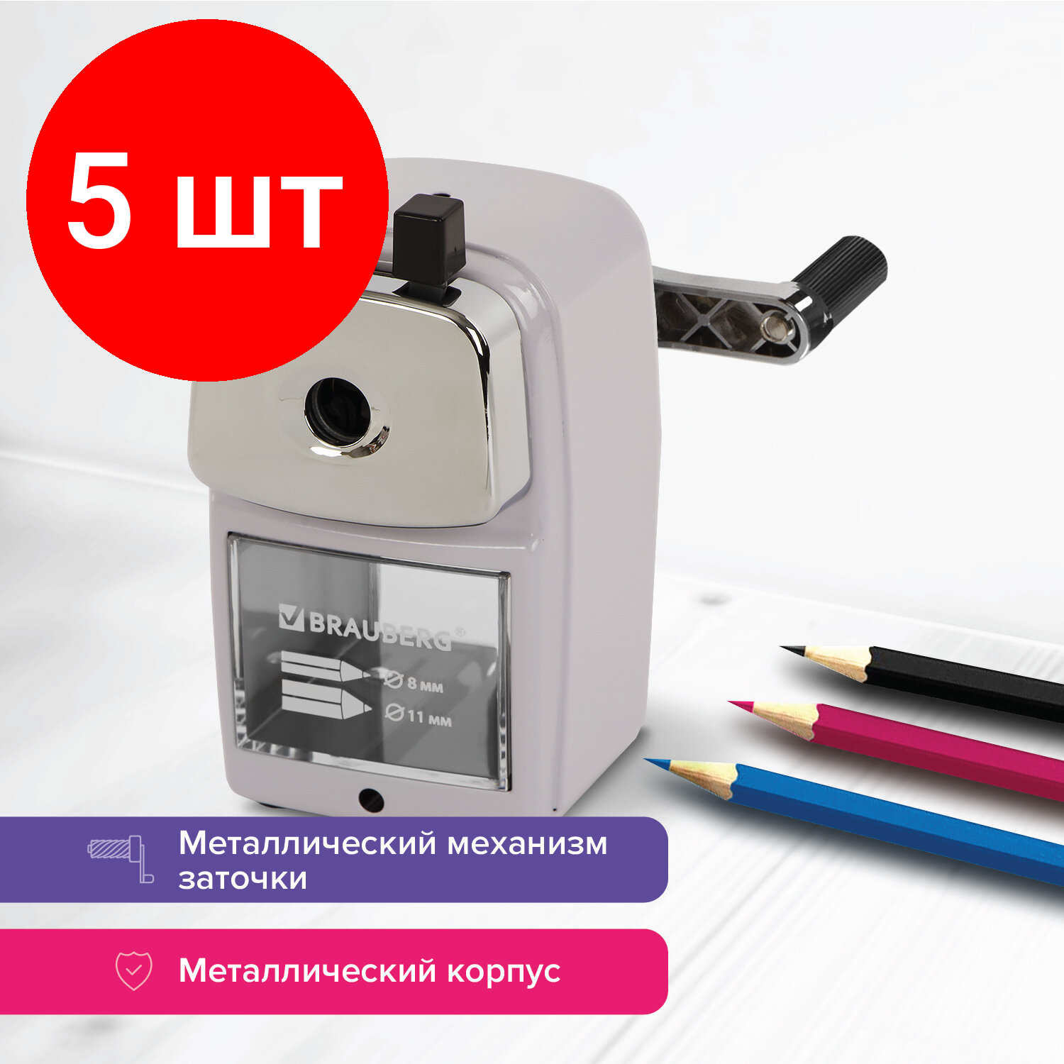 Купить Комплект 5 шт, Точилка механическая BRAUBERG "METALLIC-X", для ч/гр и цветных карандашей (в том числе утолщенных), крепление, металлический корпус, 228481