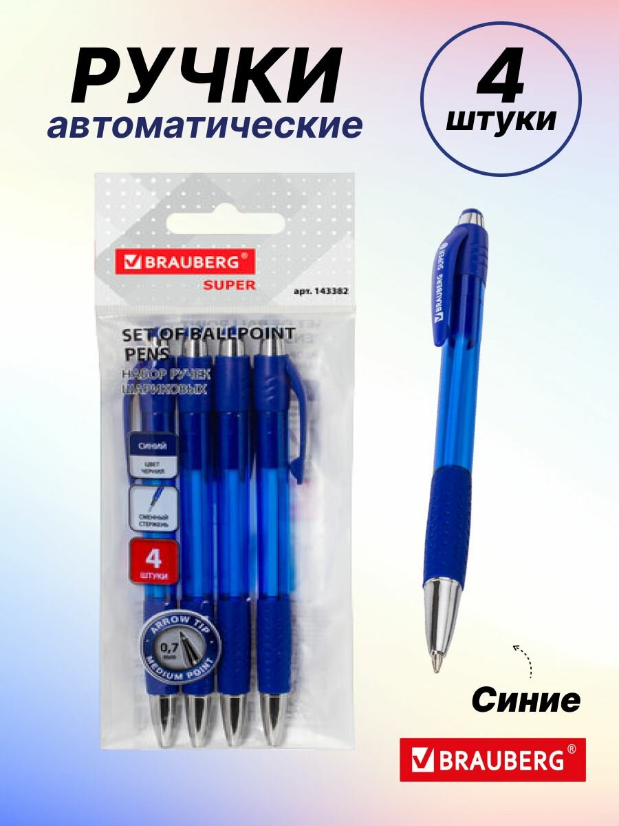 Купить Ручки шариковые автоматические синие "набор 4 штуки" BRAUBERG "SUPER", линия 0.35 мм, 143382