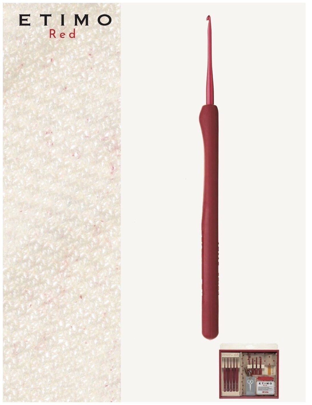 | Дополнительная информация | Всемирно любимая серия ETIMO теперь в красном цвете. Гладкое ощущение и удобный, мягкий захват! Крючок легко ложится в руки, тем самым предотвращая усталость при вязании. Эргономичная ручка с мягким покрытием. Матовый цвет красного кончика не отражает свет и мягко воздействует на глаза. Форма кончика крючка обеспечивает плавное прохождение в петлю и крепкий захват нити. |