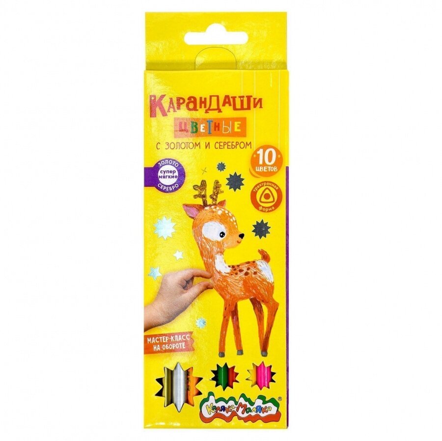 Набор цветных карандашей Каляка-Маляка 10 цветов, трехгранные, золото и серебро (КТЗСКМ10)