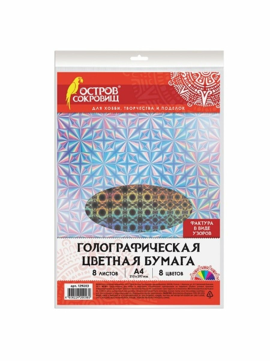 Цветная бумага, А4, голографическая, 8 листов 8 цветов, «узоры», в пакете, 80 г/м2, остров сокровищ, 210×297 мм интересное: