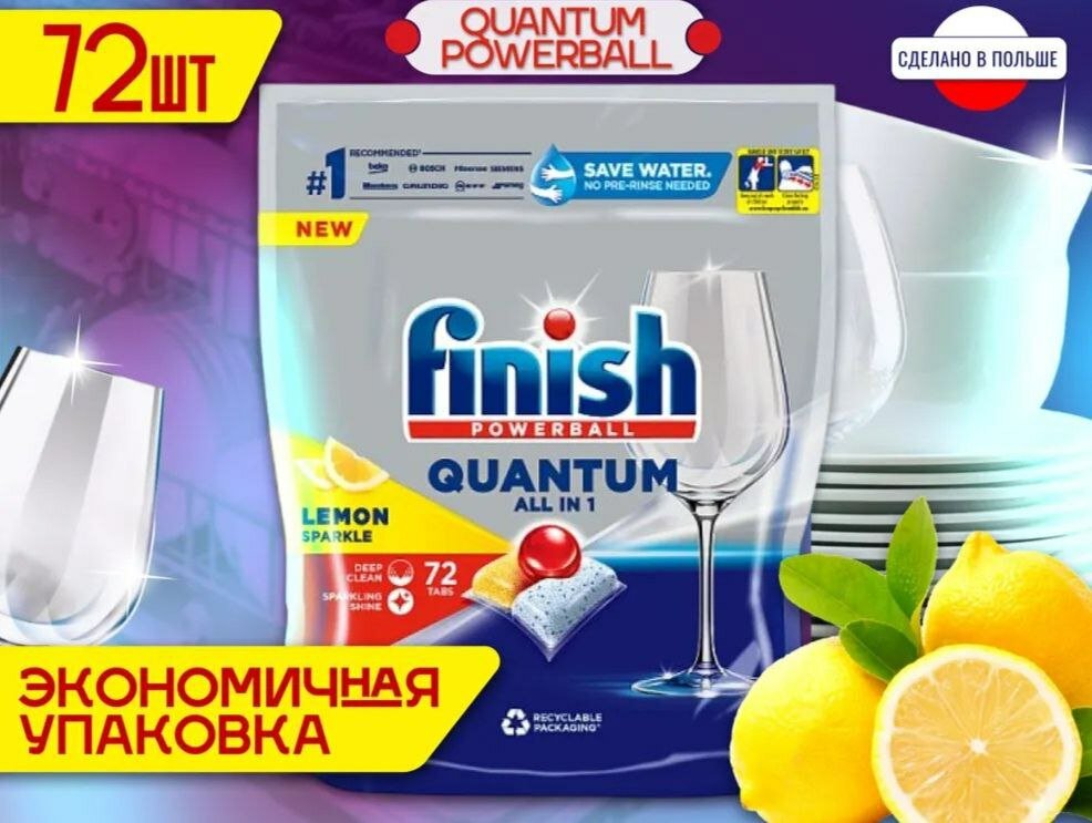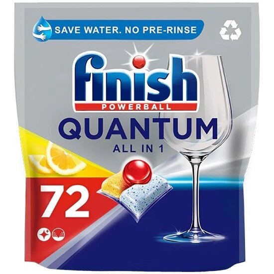 | Комплектация | Капсулы для посудомоечной машины Finish Quantum Powerball All in 1 Lemon (Финиш Квантум все в 1 с ароматом лимона), 1 упаковка - 72 шт.. |