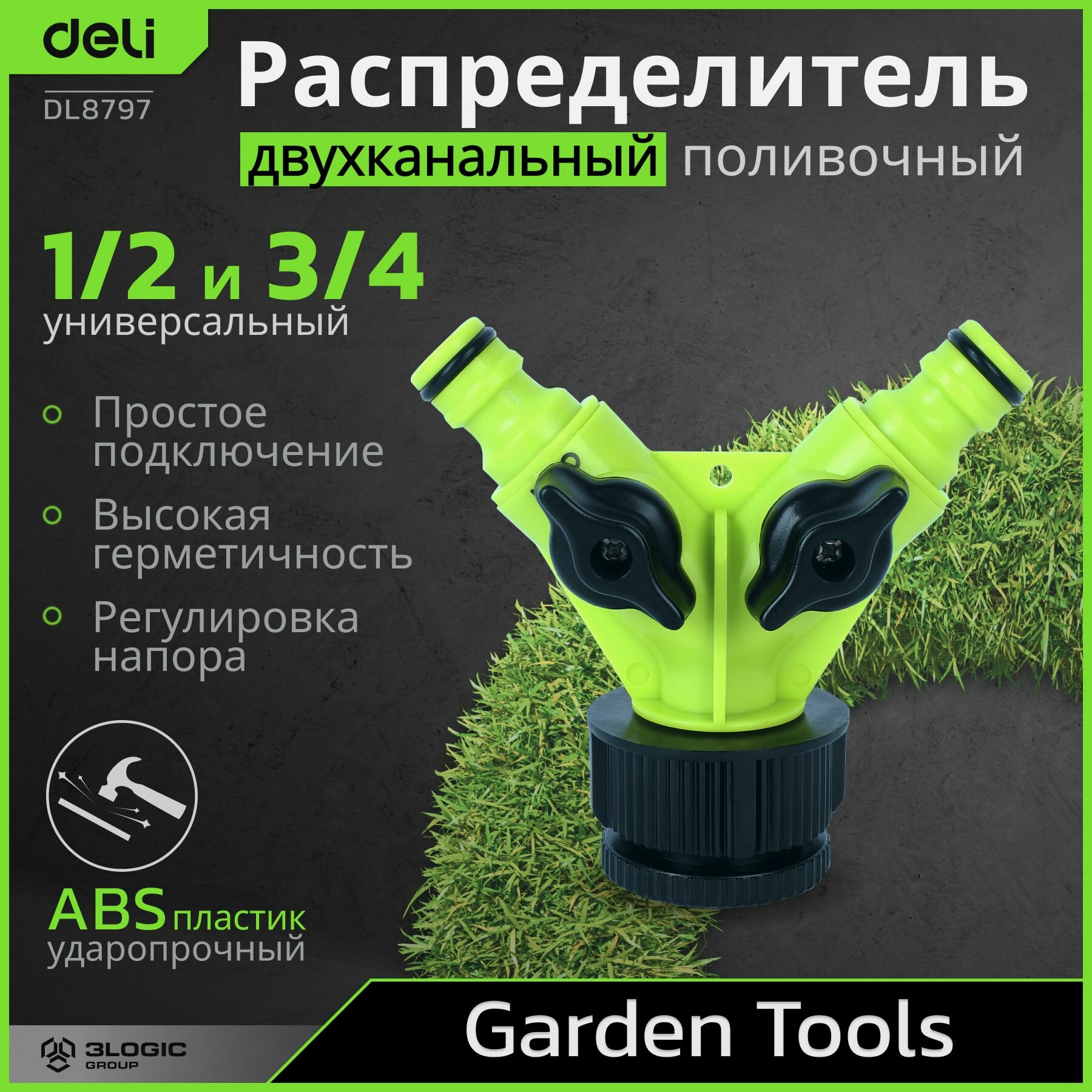 Купить Распределитель поливочный двухканальный Deli DL8797 (1/2 и 3/4 дюйма, внутренняя резьба, 2 вентиля, ударопрочный ABS-пластик)