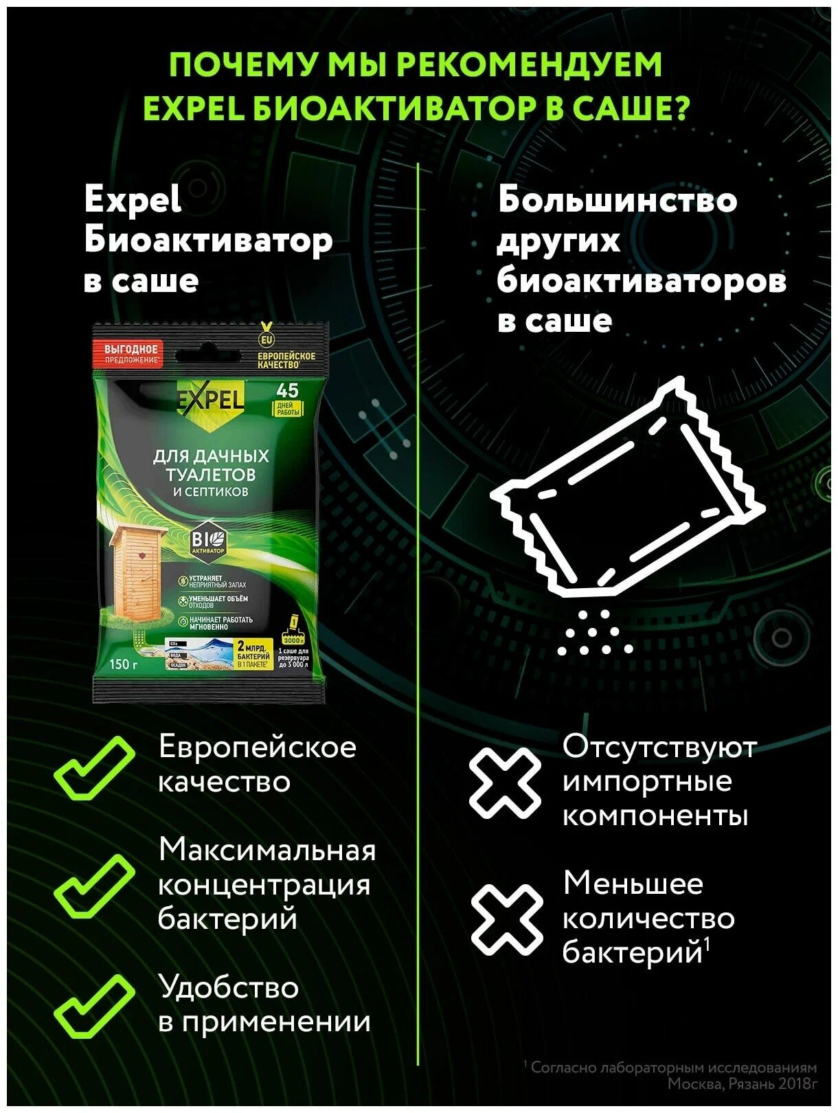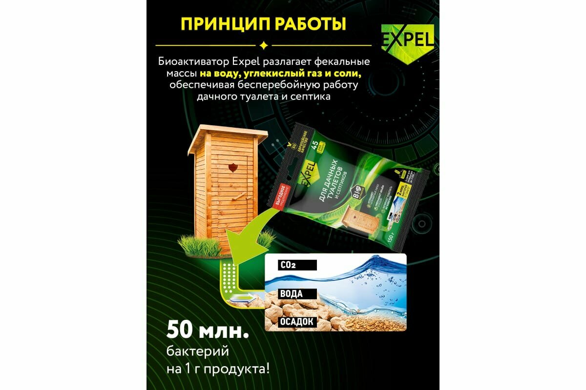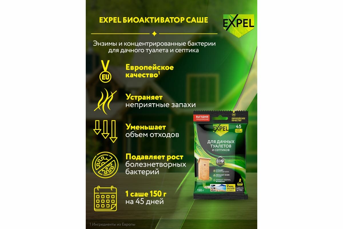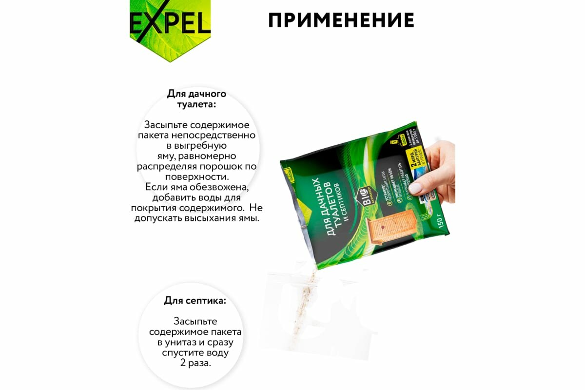 | Дополнительная информация | Биоактиватор Expel для дачных туалетов и септиков, 150 г саше 1 шт |