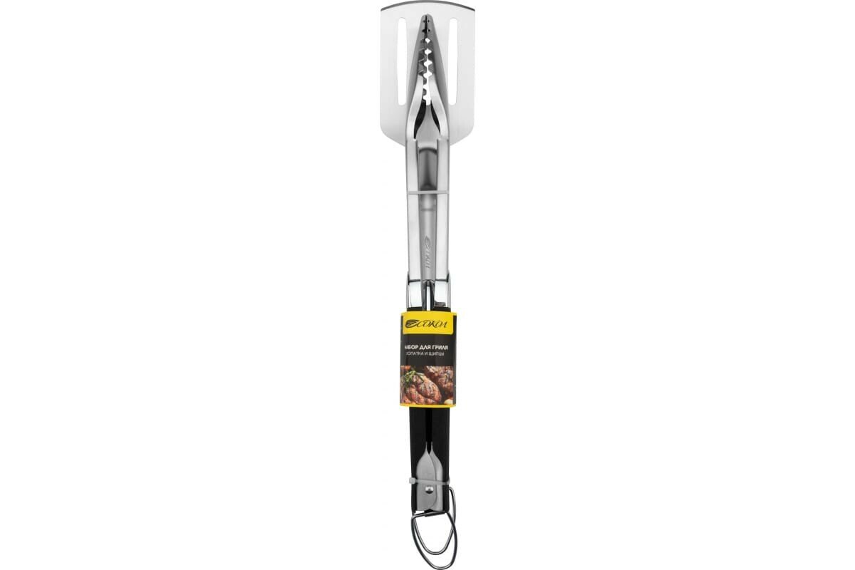 Набор для гриля, барбекю, мангала из нержавеющей стали с термопластичной резиновой рукояткой, щипцы + лопатка СОКОЛ