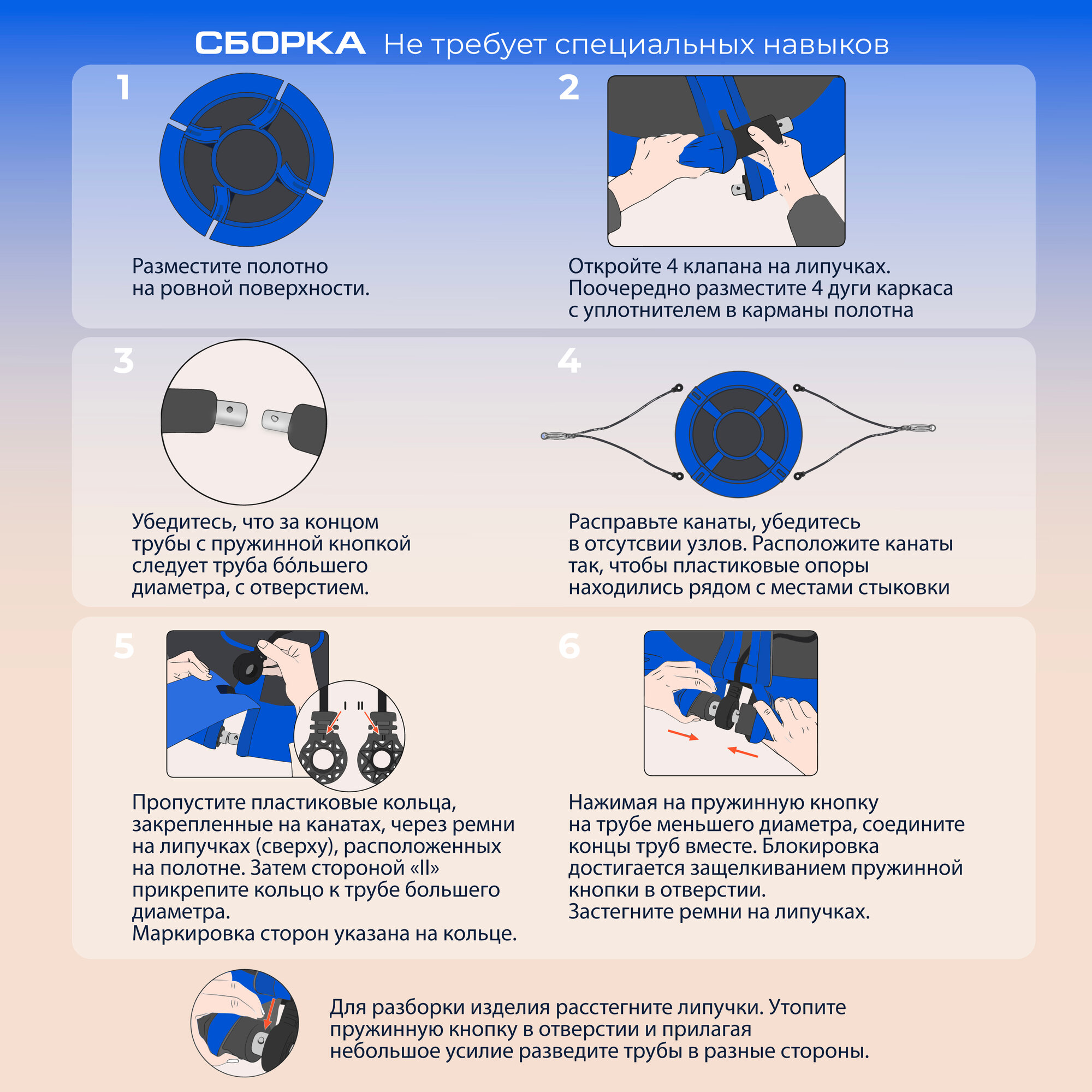 | Комплектация | Полотно - 1шт., подвесной канат с пластиковыми кольцами - 2 шт, дуги каркаса с уплотнителем - 4 шт., фурнитура |