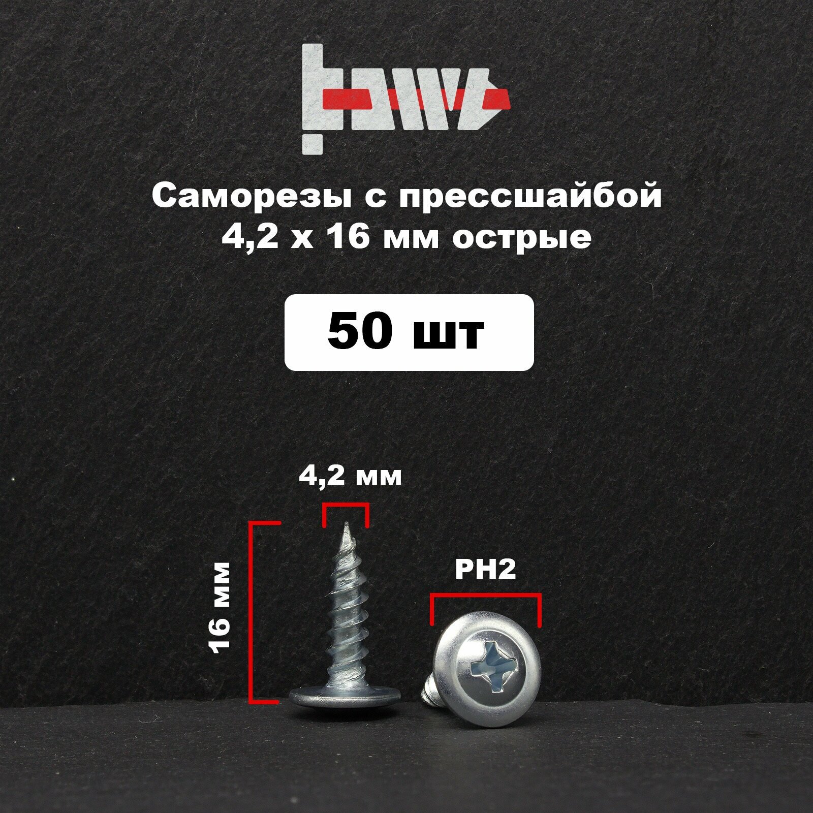 Купить Саморезы по металлу с прессшайбой острые 4,2х16 50 шт