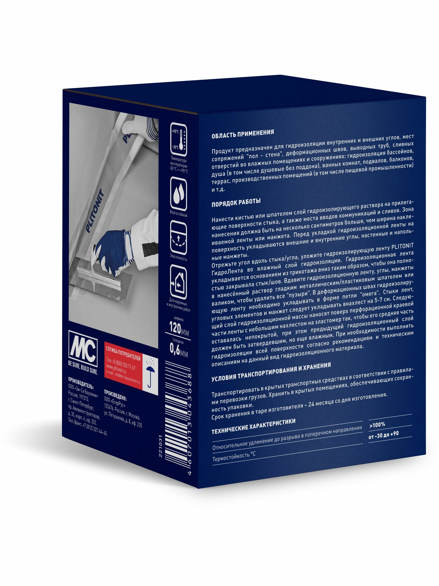 | Дополнительная информация | Гидролента PLITONIT гидроизоляционная лента -10 п.м/упак |