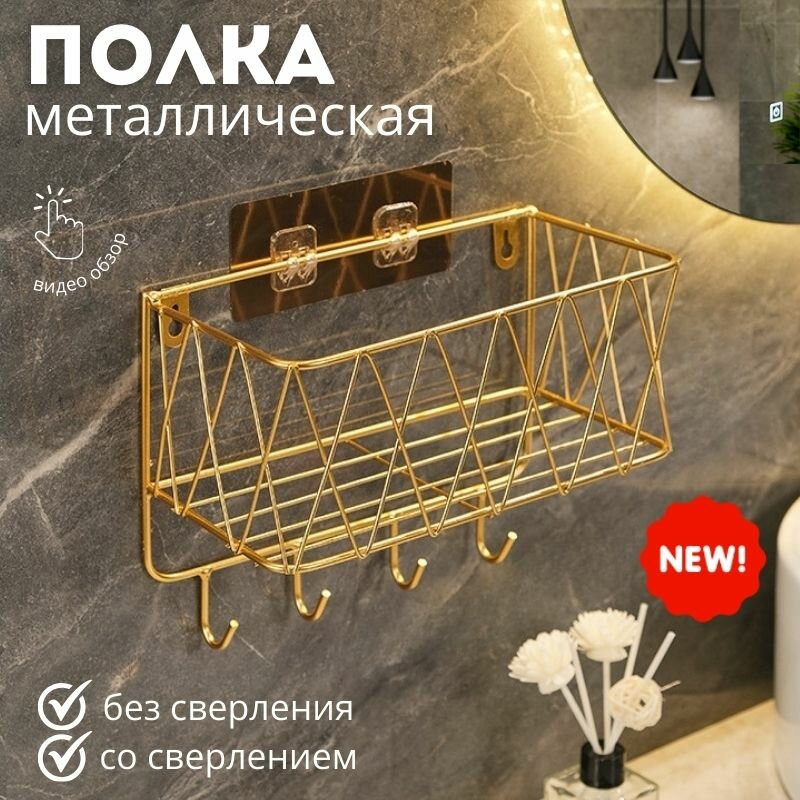Полка металлическая для ванной с крючками, без сверления, золотая интересное:
