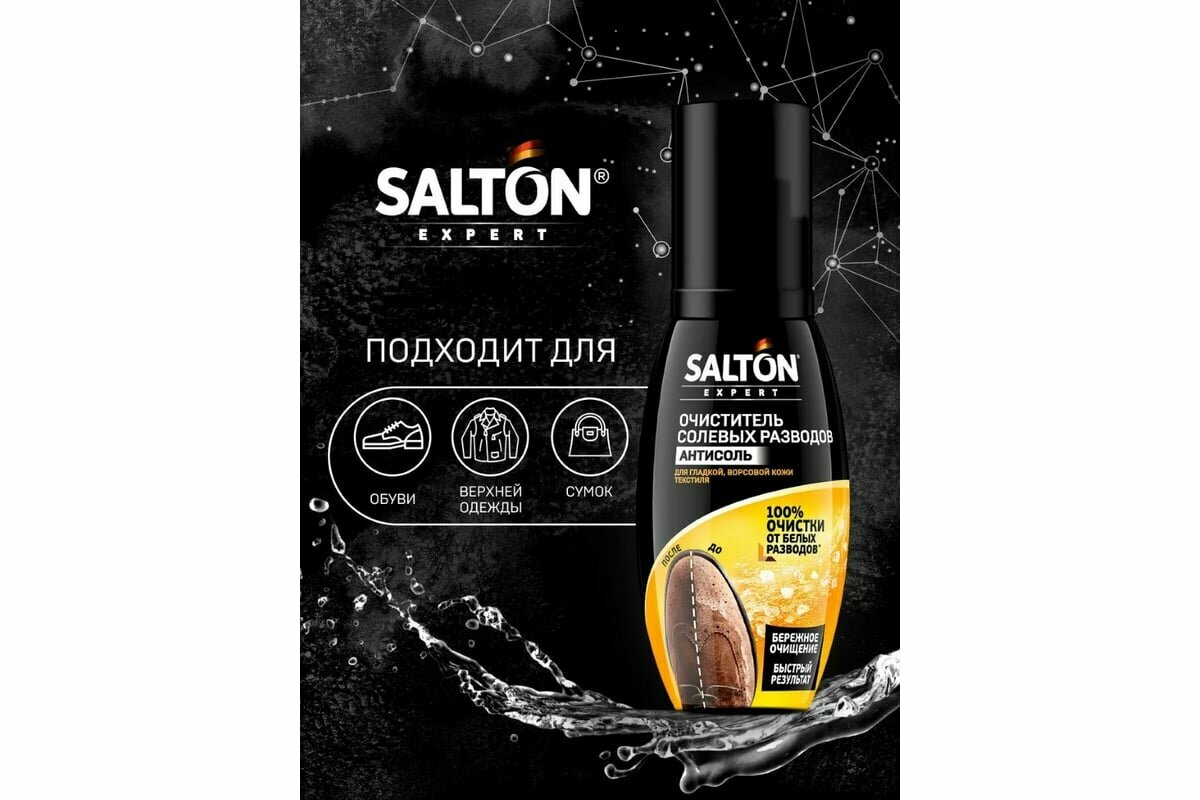 Ниже Вы можете прочитать отзывы на Антисоль SALTON Expert очиститель разводов для обуви от соли и реагентов, 100 мл, ознакомится с подробными характеристиками, посмотреть интересные обзоры и фотографии на Антисоль SALTON Expert очиститель разводов для обуви от соли и реагентов, 100 мл.
