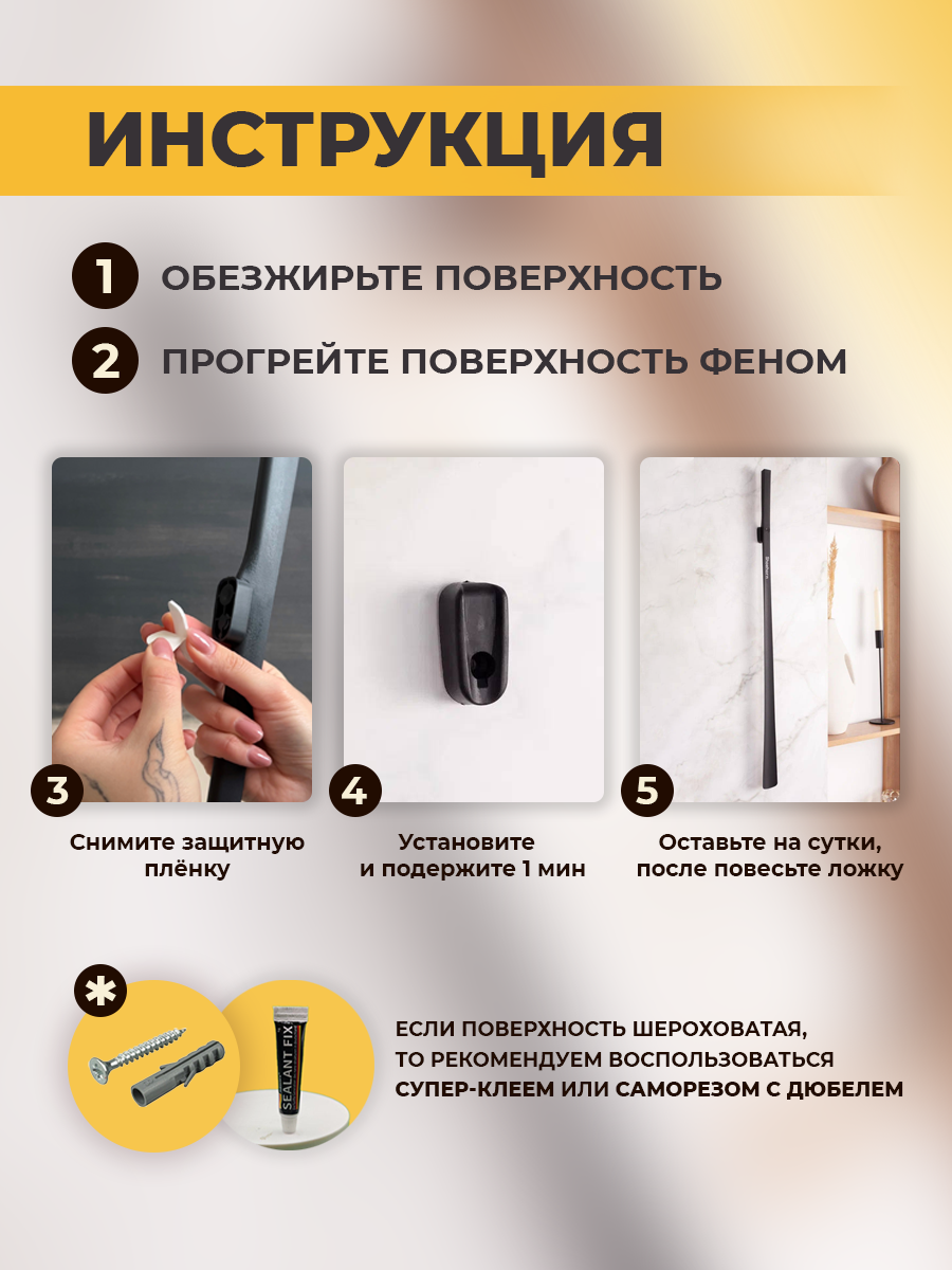| Комплектация | Ложка для обуви - 1 шт/ Магнитный держатель с клейкой лентой - 1 шт/ доп. клейкая лента - 1шт/ Саморез с дюбелем - 1 шт/ Картонная коробка - 1 шт |
