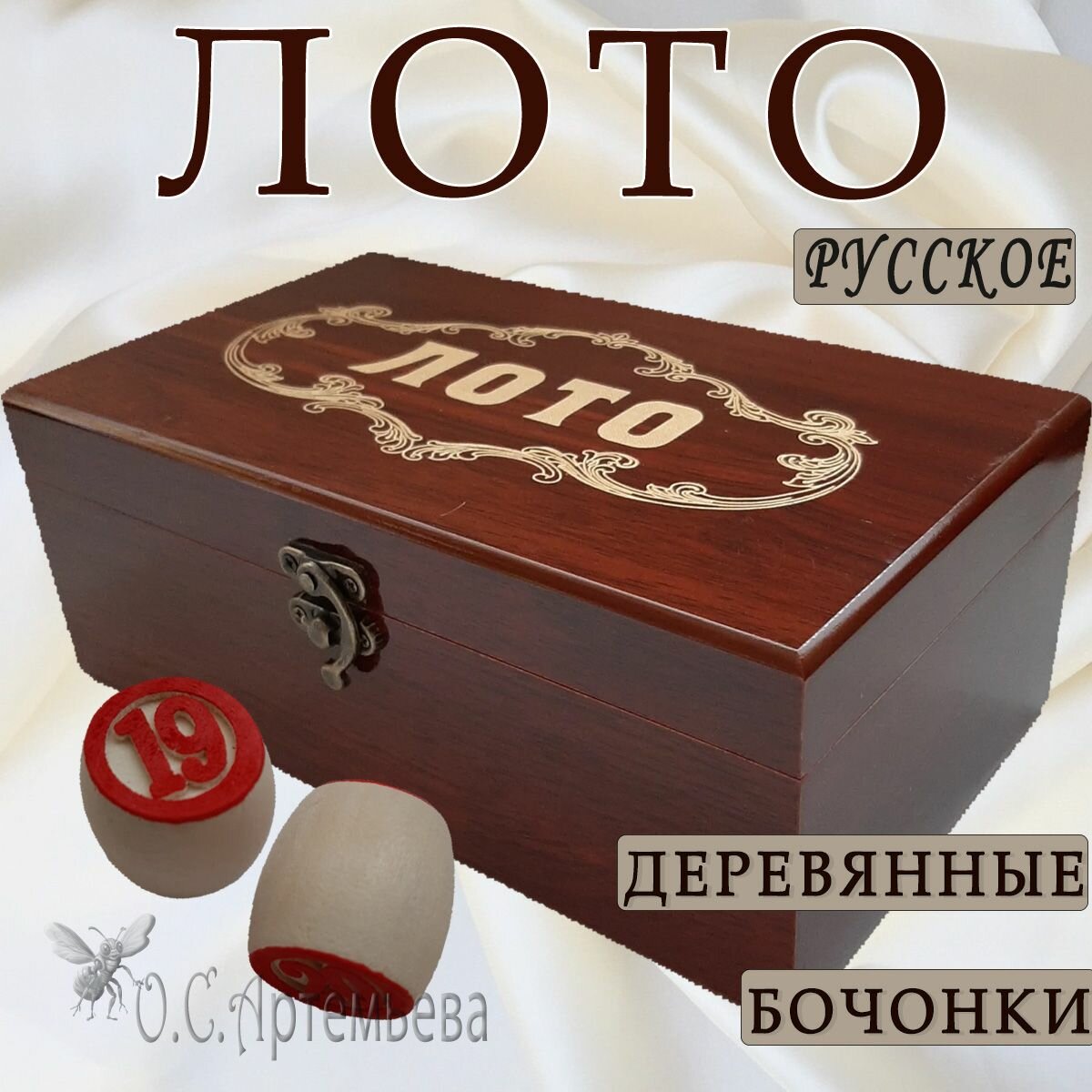 Настольная игра Русское лото с деревянными бочонками в стильной шкатулке под дерево, крышка с резным рисунком арабеска