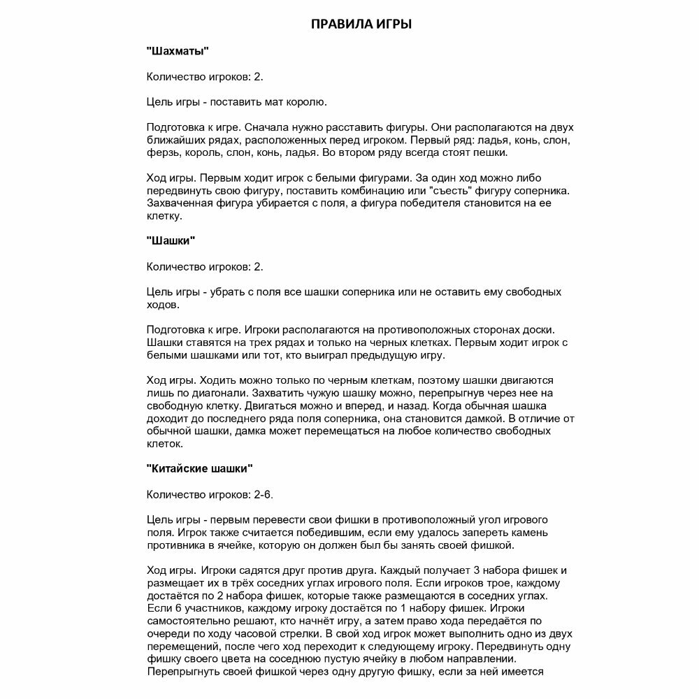 | Подробная комплектация | доска; 36 шашек (черные - 12 шт., красные - 12 шт., белые - 4 шт., зеленые - 4 шт., синие - 4 шт.); 32 шахматные фигуры (черные - 16 шт., белые - 16 шт.); 18 фишек (зеленые - 6 шт., красные - 6 шт., желтые - 6 шт.); игральный кубик. |