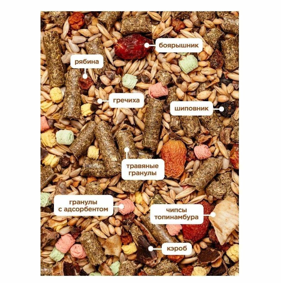 | Состав | Пшеница, ячмень, овёс, кукуруза, плоды шиповника, плоды рябины, плоды боярышника, топинамбур, короб, семечки подсолнечника, кукурузные хлопья, семена гречихи, семена льна, травяные гранулы, витамины, микроэлементы. |