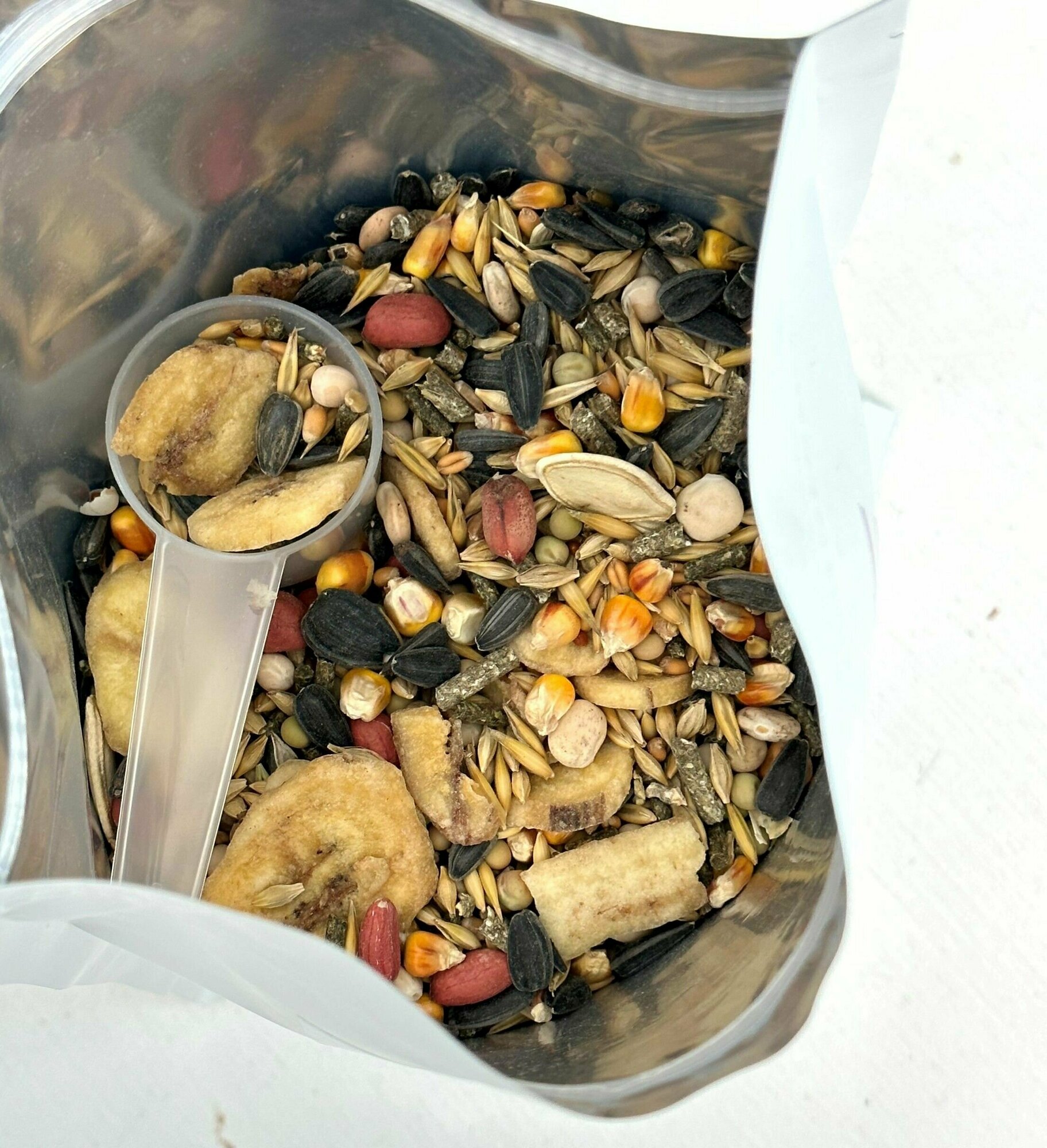 | Состав | пшеница мягких сортов, ячмень, кукуруза, горох, семечки подсолнечника, просо, витаминный комплекс, люцерна в гранулах, люпин, арахис, сухофрукты, овес, семечки тыквенные, сушенный банан. |