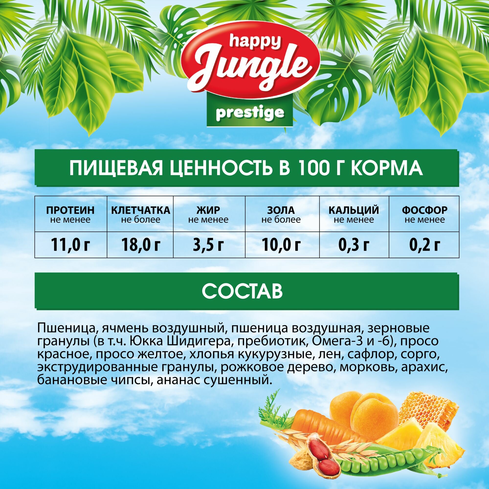 | Состав | пшеница, ячмень воздушный, пшеница воздушная, зерновые гранулы (т.ч. Юкка Шидигера, пребиотик, Омега-3 и -6), просо красное, просо желтое, хлопья кукурузные, лен, сафлор, сорго, экструдированные гранулы, рожковое дерево, морковь, арахис. банановые чипсы, ананас сушенный |