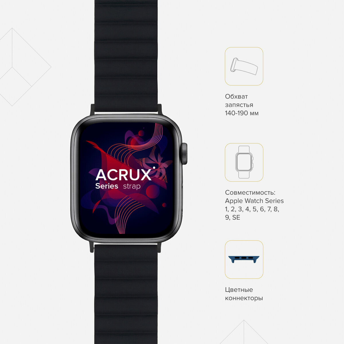 | Совместимые модели умных часов | Apple Watch 1/2/3 - 38 мм; Apple Watch 4/5/6/SE - 40 мм.; Apple Watch 7/8/9 - 41 мм;, Apple Watch 38 мм/ 40 мм |