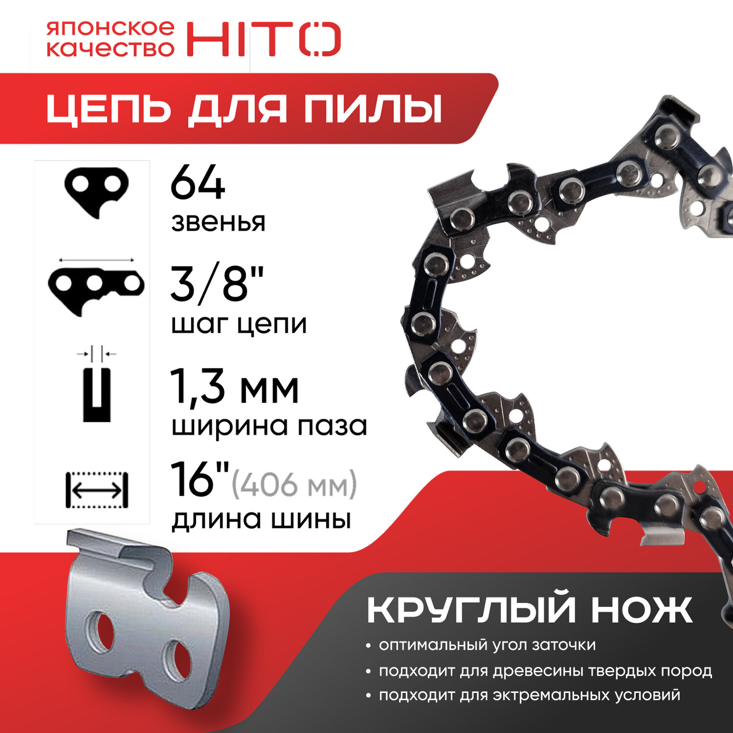 Цепь для бензопил / цепь для электропил / цепь пильная HITO 16", паз 1.3 мм, шаг 3/8, 64 звена, круглый нож интересное: