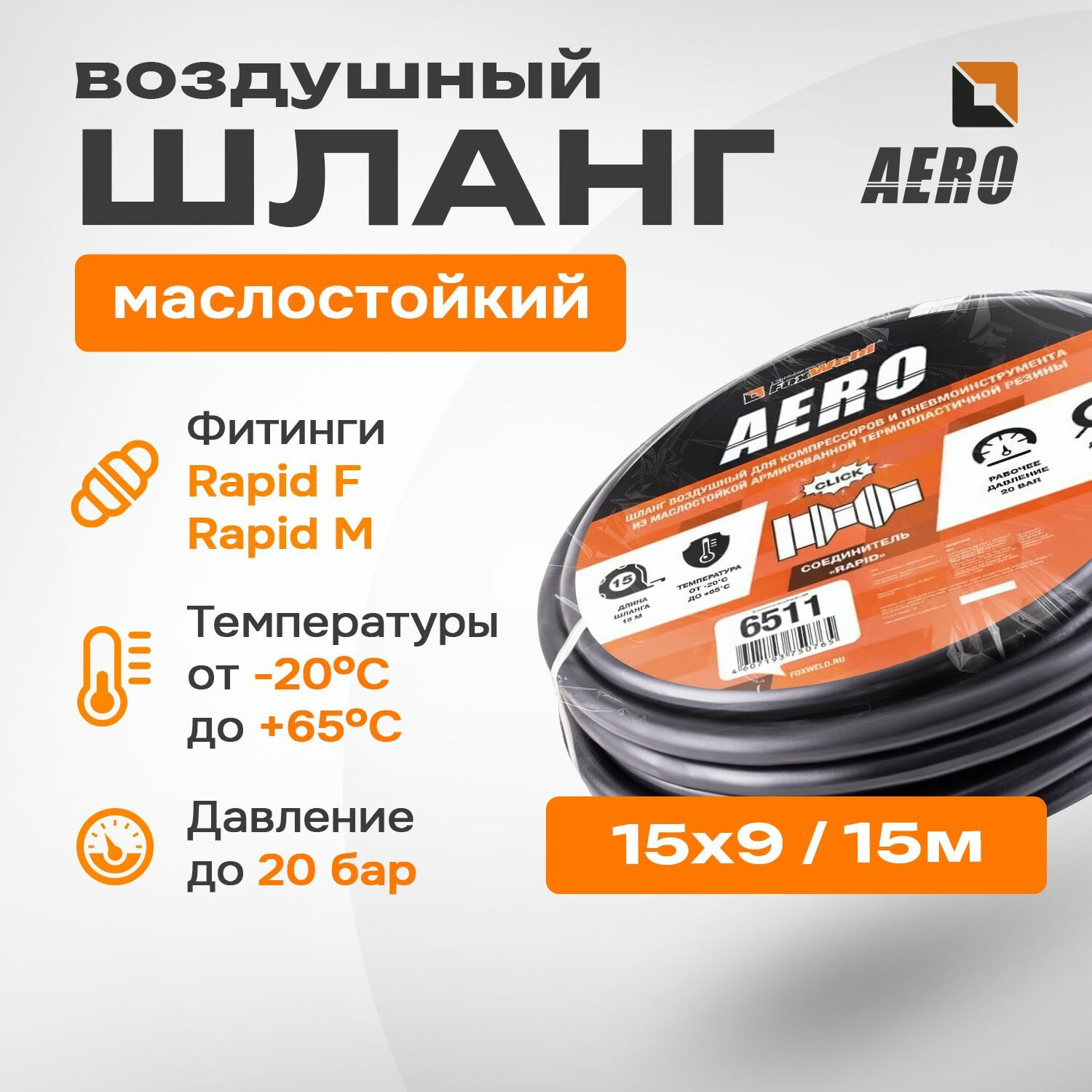 Шланг Foxweld AERO воздушный для компрессоров и пневмоинструмента с фитингами рапид, маслостойкая армированная термопластичная резина, 20бар, 9x15мм, 15м интересное: