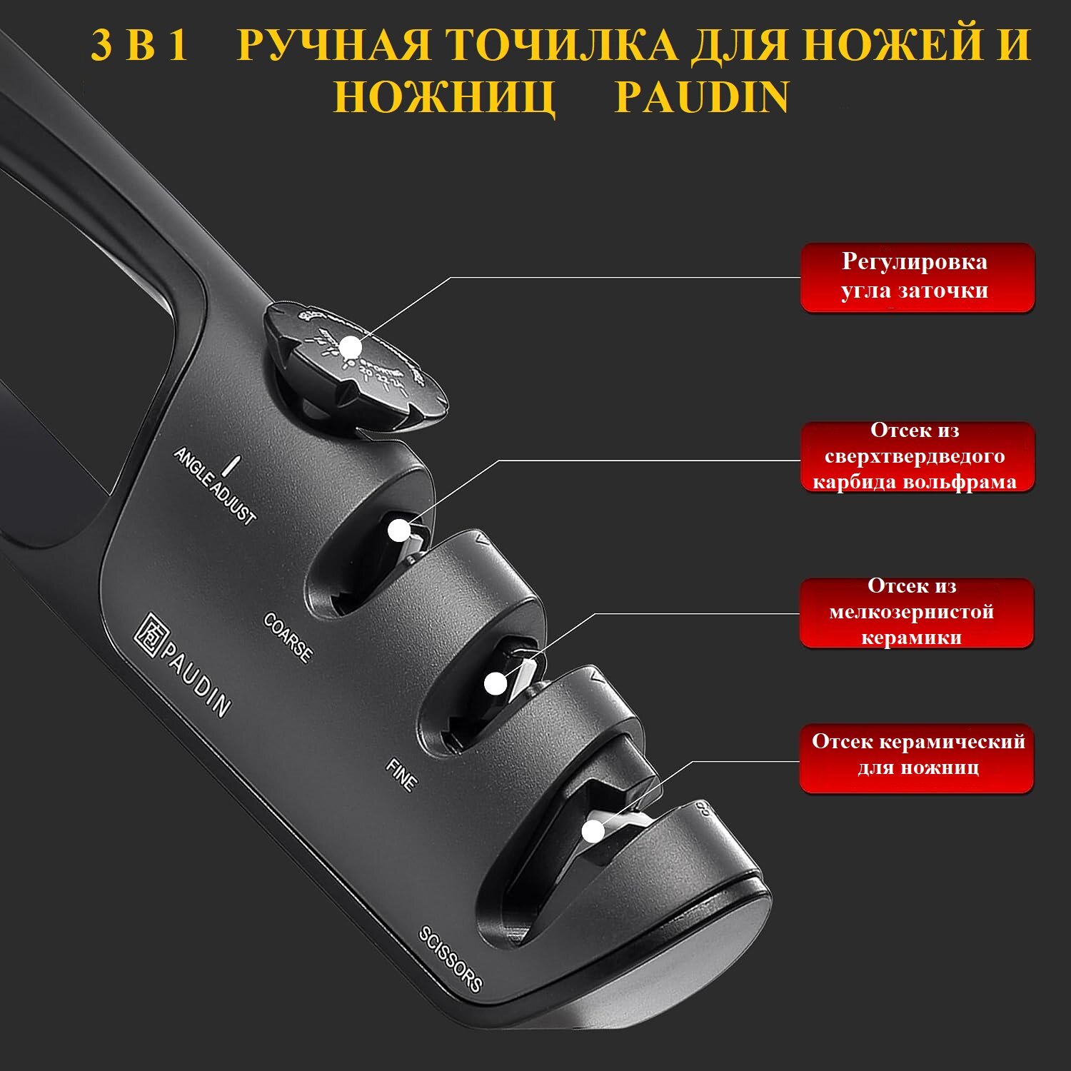 PAUDIN Pro / Точилка для ножей и ножниц ножеточка ручная настольная, механическая, трехступенчатая, регулируемая