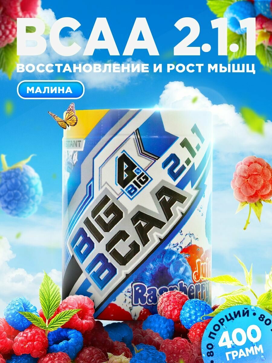 BCAA 2:1:1 BIGSNT спортивное питание / комплекс незаменимых аминокислот для роста мышц, порошок, 400 г (80 порций), вкус Малина