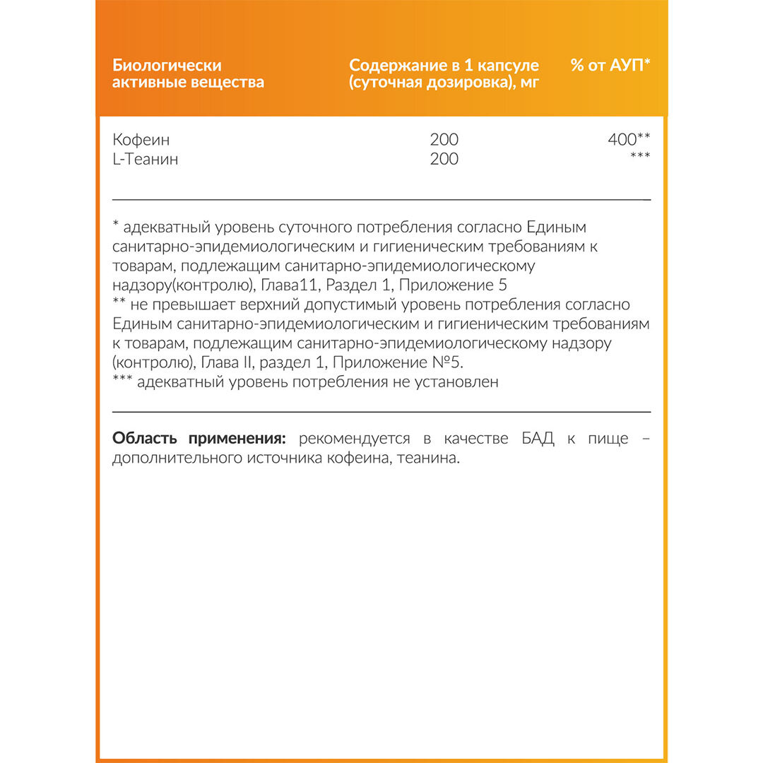 | Дополнительная информация | назначение: великолепно сохраняет высокую работоспособность на протяжении всей тренировки; улучшает функциональное состояние организма; препятствует разрушению мышечных волокон; активизирует процесс адаптации к нагрузкам, обеспечивает быстрое и эффективное восстановление; оказывает благотворное влияние на липидный обмен, ускоряя сжигание излишков жировой ткани; незаменим при высоких нагрузках; обеспечивает проведение тренировок с максимальной пользой; рекомендации по применению: Рекомендуется принимать кофеин по одной капсуле не более 2 раз в день с перерывом между приемами не менее 2-3 часов. Caffeine 200mg содержит концентрированную дозу чистого кофеина, эквивалентную 2 чашкам свежесваренного кофе; состав: кофеин безводный - 200 мг, желатин, микрокристаллическая целлюлоза, стеарат магния. |