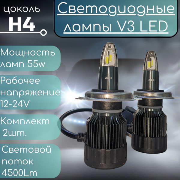 Светодиодные лампы H4 лед диоды 55w 6000К Led V3 Nightdog
